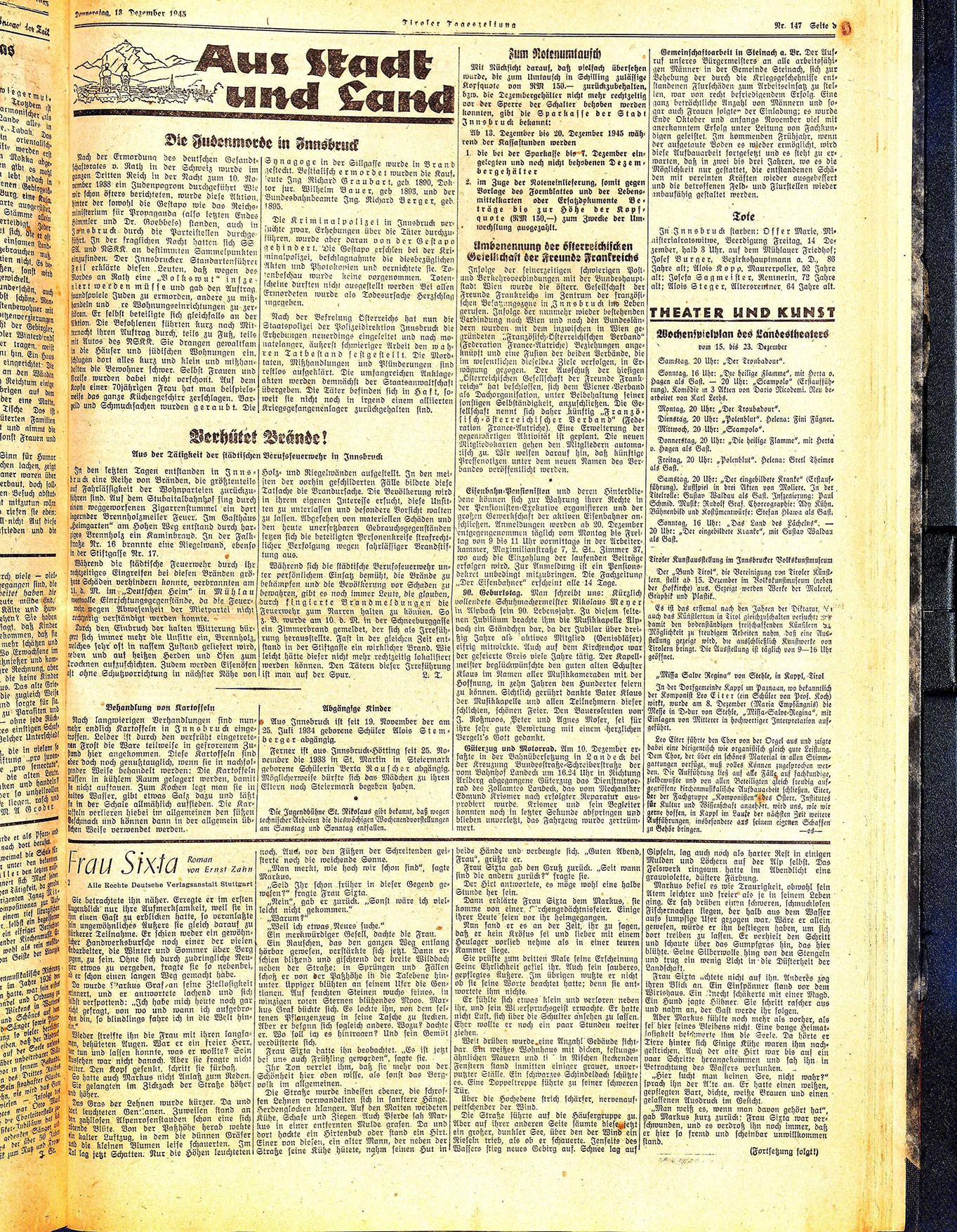 In Innsbruck starben: Offer Marie, Ministerialratswitwe, Beerdigung Freitag, 14 Dezember, halb 3 Uhr, auf dem Mühlauer Friedhof; Josef Burger, Bezirkshauptmann a. D., 86 Jahre alt; Alois Kopp, Maurerpolier, 52 Jahre alt; Josefa Sagmeister, Rentnerin, 72 Jahre alt; Alois Steger, Altersrentner. 64 Jahre alt.