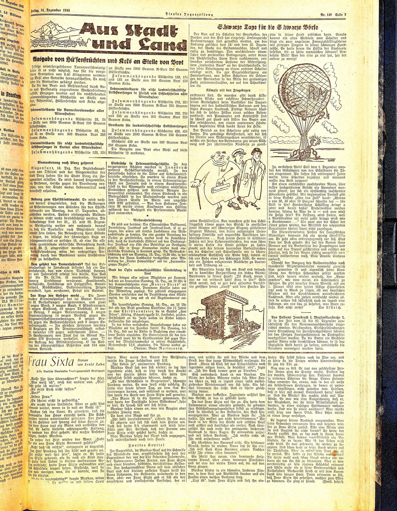 Das Postamt Innsbruck I, Maximilianstraße 2, ist in der Zeit vom 13. bis 22. Dezember ausschließlich für den Notenumtauschverkehr eingerichtet worden. Briefmarken, Einschreibsendungen sowie Einzahlung der Fernsprechgebühren können bei den übrigen Zweigpostämtern im Stadtgebiet durchgeführt werden. Da die Amter ein Wechseln großer Noten nicht durchführen können, so ist das abgezählte Geld bereit zu halten, andernfalls die Annahme verweigert werden kann.