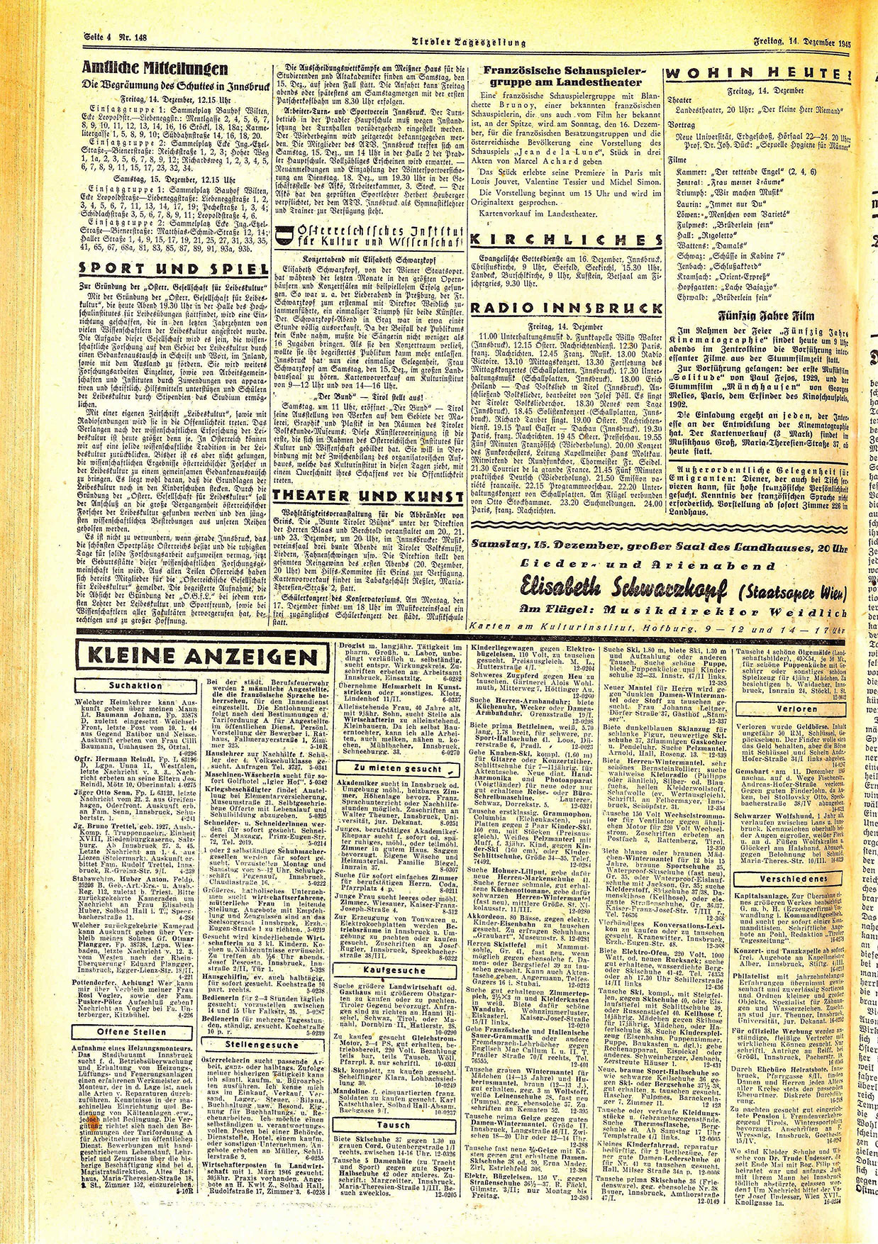 Elisabeth Schwarzkopf, von der Wiener Staatsoper. hat während der letzten Monate in den größten Opernhäusern und Konzertsälen mit beispiellosem Erfolg gesungen. So war u. a. der Liederabend in Preßburg, der Fr. Schwarzkopf zum erstenmal mit Direktor Weidlich zusammenführte, ein einmaliger Triumph für beide Künstler. Der Schwarzkopf=Abend in Graz war in etwa einer Stunde völlig ausverkauft. Da der Beifall des Publikums kein Ende nahm, mußte die Sängerin nicht weniger als 16 Zugaben bringen. Als sie den Konzertraum verließ, wollte sie ihr begeistertes Publikum kaum mehr entlassen. Innsbruck hat nun eine einmalige Gelegenheit, Frau Schwarzkopf am Samstag, den 15. Dez., im großen Landhaussaal zu hören. Kartenvorverkauf am Kulturinstitut von 9—12