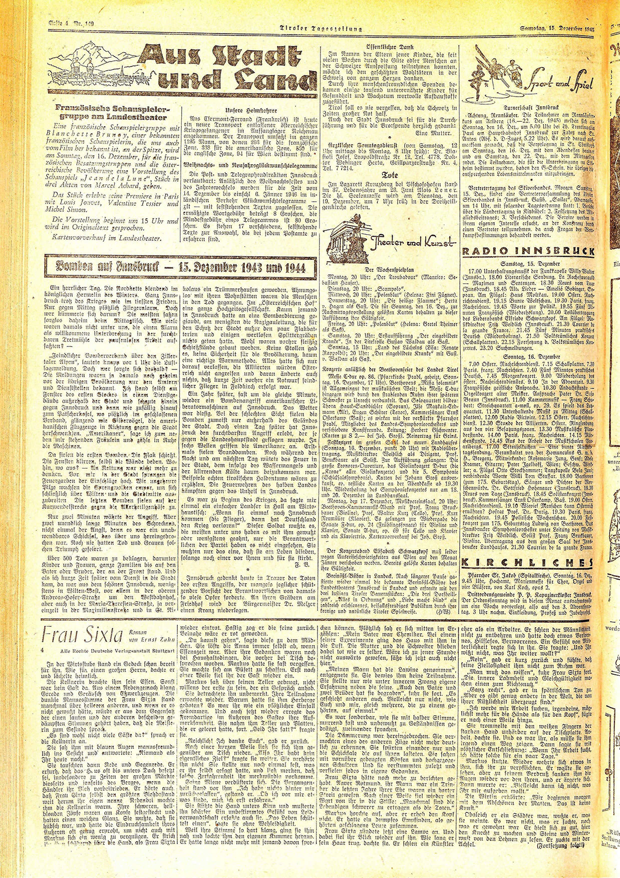 Eine französische Schauspielergruppe mit Blanchette Brunsy, einer bekannten französischen Schauspielermn, die uns auch vom Film ber bekannt ist, an der Spitze, wird am Sonntag, den 16. Dezember, für die französischen Besatzungstruppen und die österreichische Bevölberung eine Vorstellung des Schauspiels „Jeandela Lune“, Stück in drei Aleten von Mercel Achard, geben.
