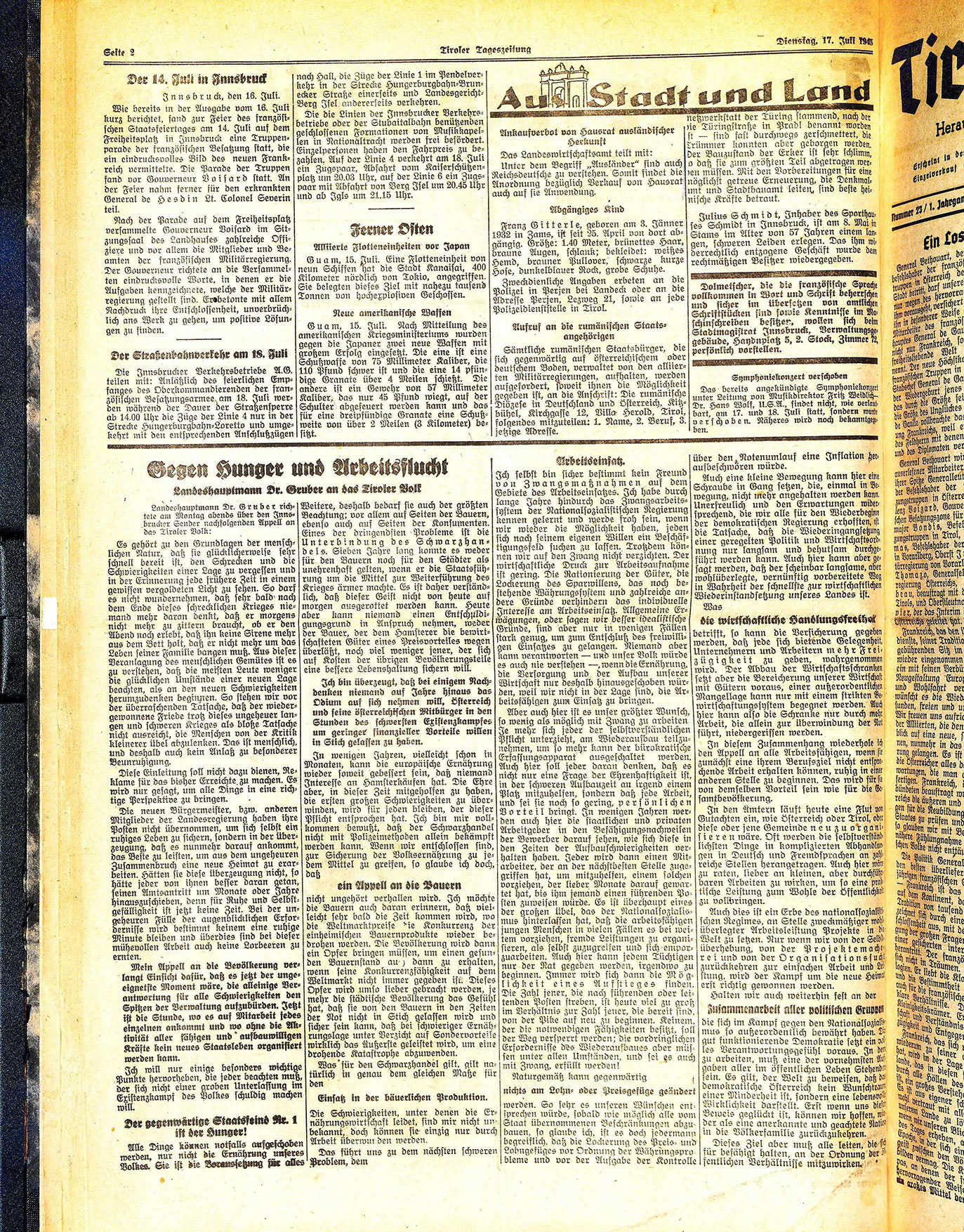 Wie bereits in der Ausgabe vom 16. Juli kurz berichtet, fand zur Feier des französischen Staatsfeiertages am 14. Juli auf dem Freiheitsplatz in Innsbruck eine Truppenparade der französischen Besatzung statt, die ein eindrucksvolles Bild des neuen Frankreich vermittelte. Die Parade der Truppen fand vor Gouverneur Voisard statt. An der Feier nahm ferner für den erkrankten General de Hesdin Lt. Colonel Severin teil.