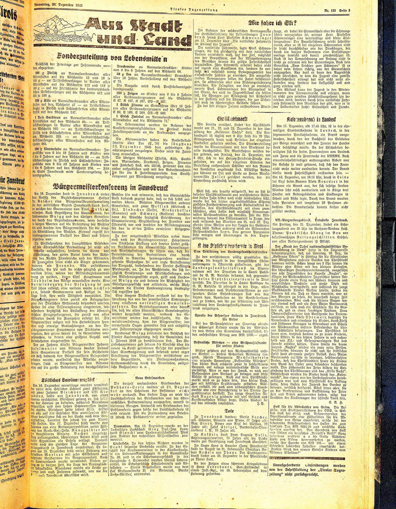 In Innsbruck starben: Maria Larcher, geb. Schreier, Bäuerin aus Pfons, 57 Jahre alt: Max Stern, Bauer aus Arzl bei Mühlau, 79 Jahre alt; Josef Stelzel, Bundesbahn=Oberrevident i. P., 70 Jahre alt.