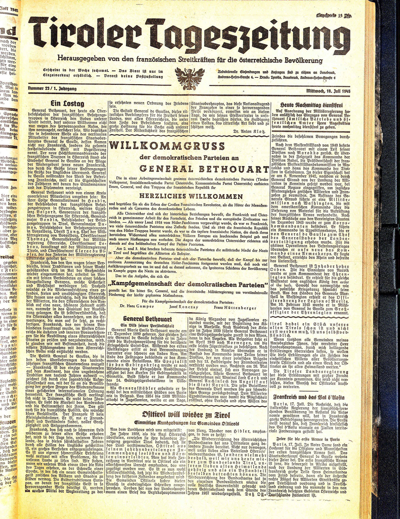 Die in einer Arbeitsgemeinschaft geeinten österreichischen demokratischen Parteien (Tiroler Volkspartei, Sozialdemokratische Partei Österreichs, Kommunistische Partei Österreichs) entbieten Ihnen, General, und den Truppen der französischen Republik ihr
