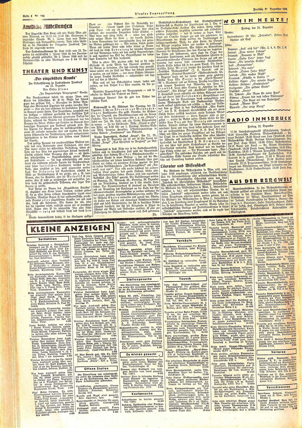 Das Landesinvalidenamt für Tirol bleibt vom 23. Dezember bis einschließlich 1. Jänner 1946 für den Parteienverkehr gänzlich geschlossen. Ab 2. Jänner 1946 wird der Parteienverkehr an allen Werktagen von 8 bis 12 Uhr festgesetzt.