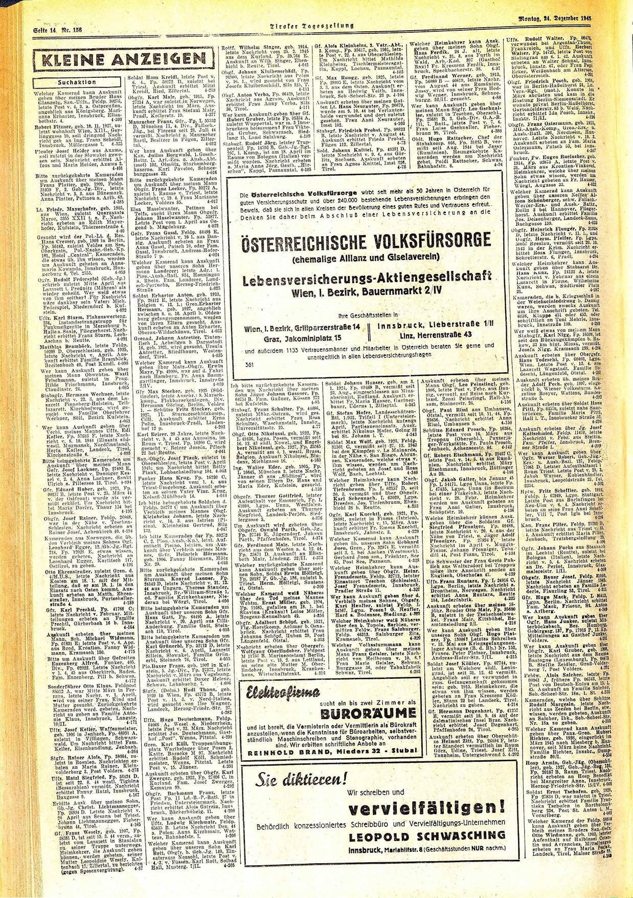 Wer weiß etwas von meinem Mann Stabsgfr. Karl Nigg, Fp. 10338, ist seit den Rückzugskämpfen b. Rakow, 33 km hint. Minsk, vermißt. Josefa Nigg, Kramsach 199. 4-294 Auskunft erbeten über Obergefr. Hans Todeschi, Fp. 60403, Lgpa. Wien. Letzte Post v. 13. 4. ausLazarett Wagstadt. Familie To. deschi, Längenfeld, Otztal. 4-293 Auskunft erbeten üb. meinen Brüder Adolf Pech. geb. 1897, eingerückt b. Wiener Volkssturm. Karoline Breyer, Wattens, Bundesstraße 5. 4-292
