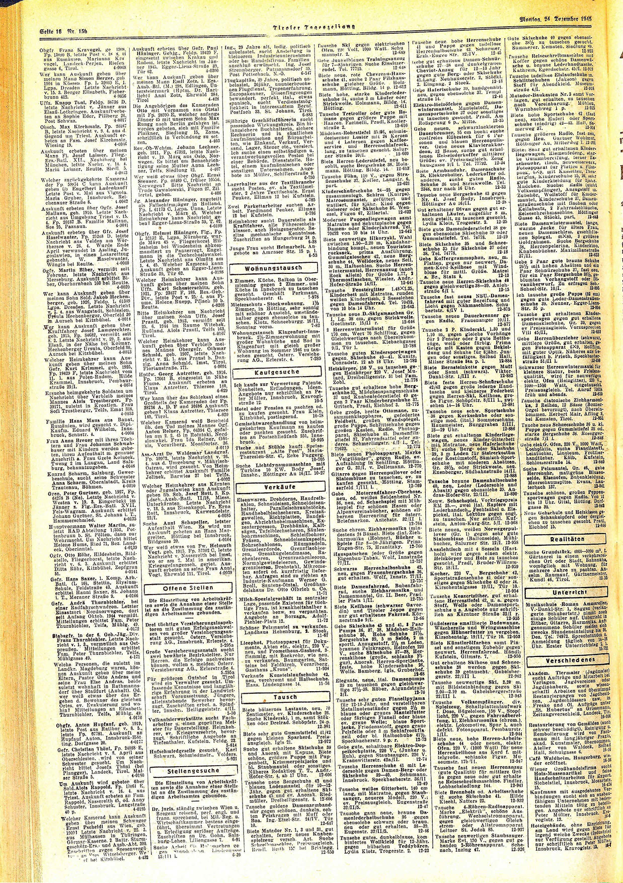 Auskunft erbeten über Gefr. Paul Häninger. Gebjg., Feldp. 19429 F. eingesetzt zwischen Krakau und Radom, letzte Nachricht im Jänner 1945. Egger-Lienz-Straße 39, rür 62. 4.0200