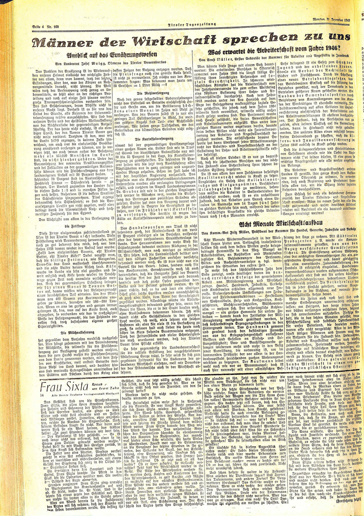 Das sind Erscheinungen, deren Abhilfe nicht in unserer Macht liegt. Deshalb ist es für uns das Gebot der Stunde, alle Reserven der Lebensmittelversorgung restlos auszuschöpfen. Wir sind das unserem Volke und der christlichen Weltauffassung von der Nächstenliebe der gegenwärtigen Notzeit schuldig. Der das heute nicht einsieht, ist ein elendiger Egoist, der den Namen Tiroler Bauer gar nicht mehr verdient. Trotzdem ist das, was wir im Lande selbst erzeugen, in keinem Falle hinreichend, um auch nur die einheimische Bevölkerung annähernd versorgen zu können, um so weniger jetzt, wo noch immer außer der Besatzung mehr als 160.000 Menschen im Lande sind, die nicht hierher gehören. Unter der Voraussetzung der normalen Bevölkerungsziffer und bei Festhalten