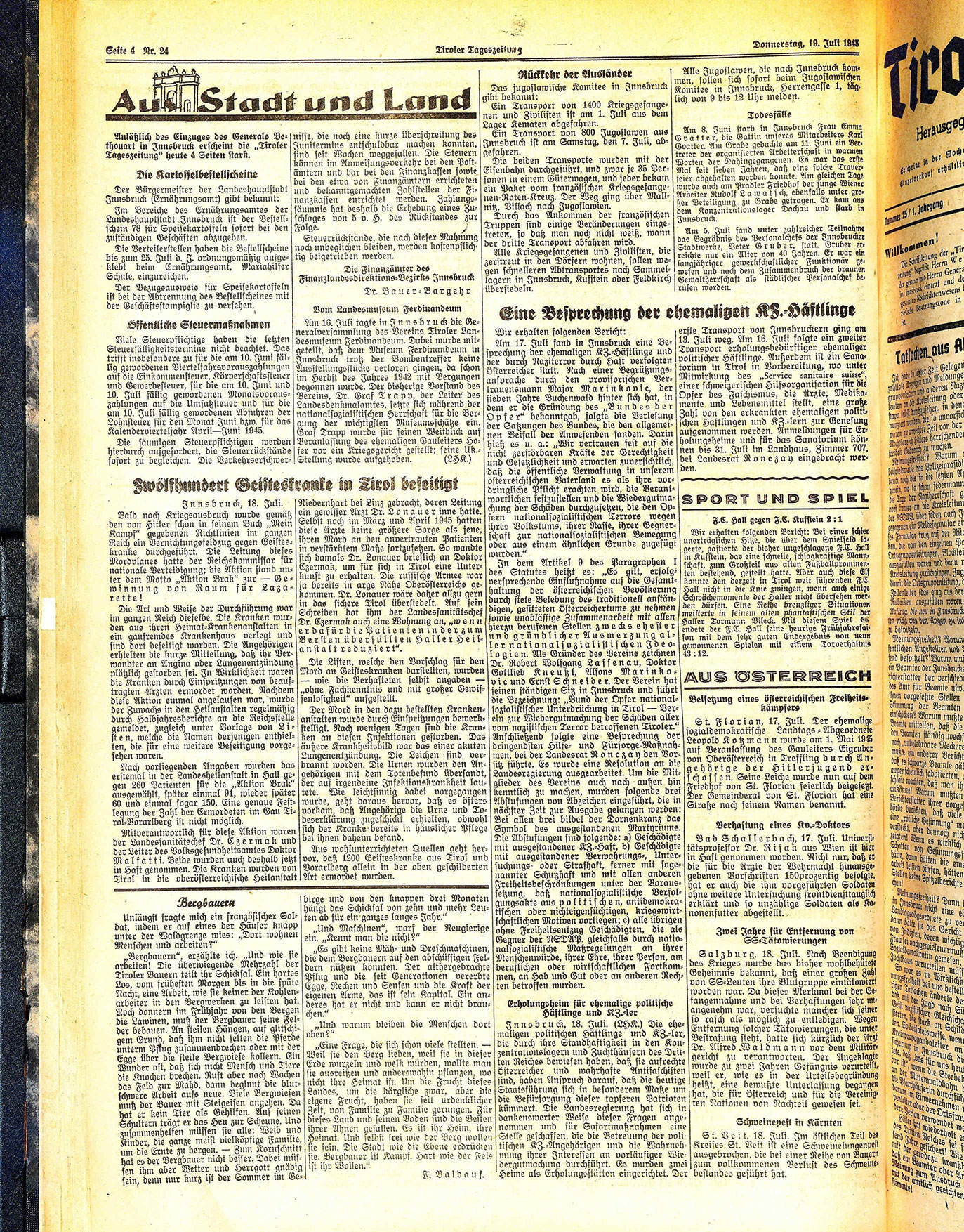erste Transport von Innsbruckern ging am 13. Juli weg. Am 16. Juli folgte ein zweiter Transport erholungsbedürftiger ehemaliger politischer Häftlinge. Außerdem ist ein Sanatorium in Tirol in Vorbereitung, wo unter Mitwirkung des „Service sanitaire suisse“ einer schweizerischen Hilfsorganisation für die Opfer des Faschismus, die Arzte, Medikamente und Lebensmittel stellt, eine große Zahl von den erkrankten ehemaligen politischen Häftlingen und KZ.=lern zur Genesung aufgenommen werden. Anmeldungen für Erholungsheime und für das Sanatorium können bis 31. Juli im Landhaus, Zimmer 707, bei Landesrat Ronczay eingebracht werden.
