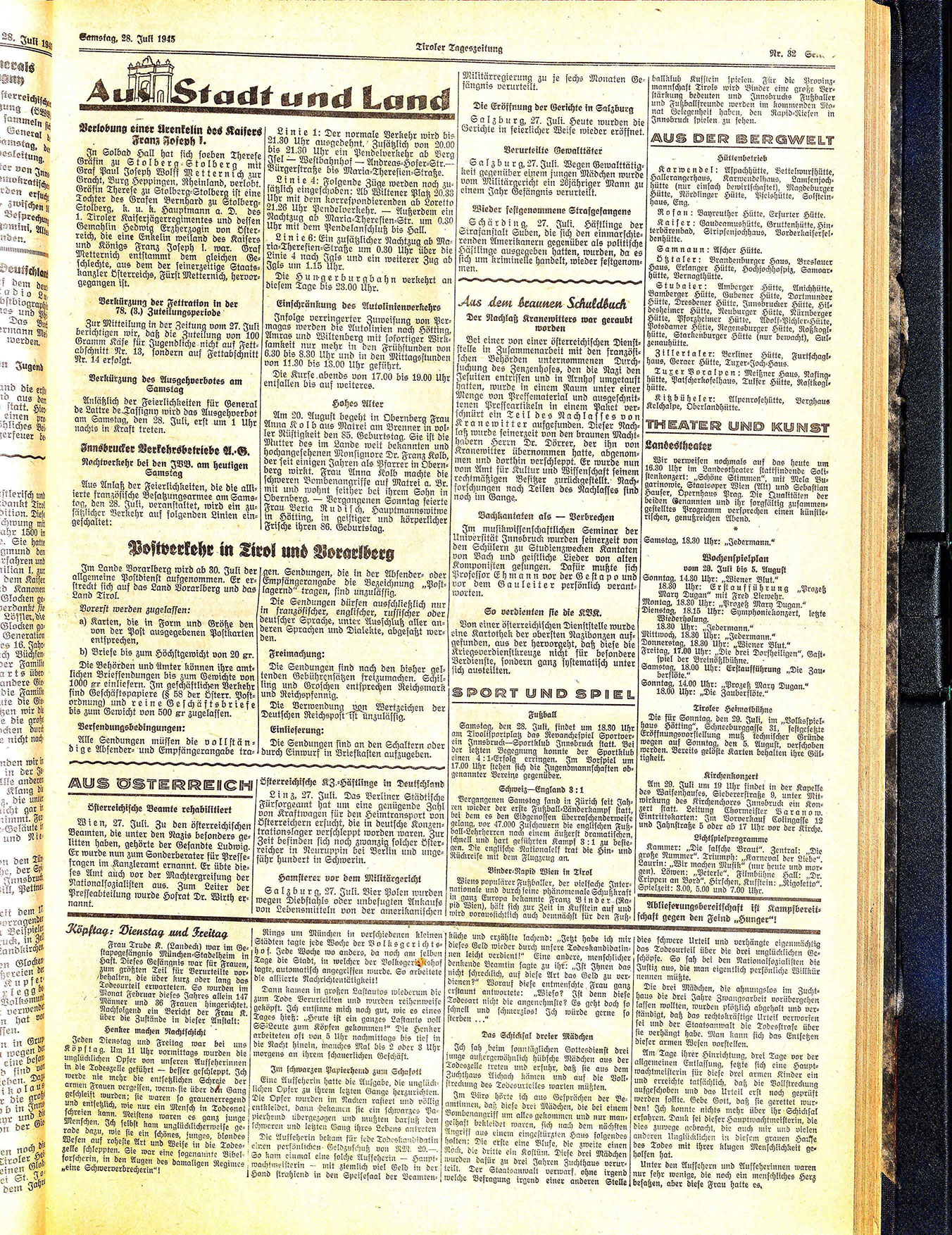 Im Lande Vorarlberg wird ab 30. Juli der allgemeine Postdienst ausgenommen. Er erstreckt sich auf das Land Vorarlberg und das Land Tirol.