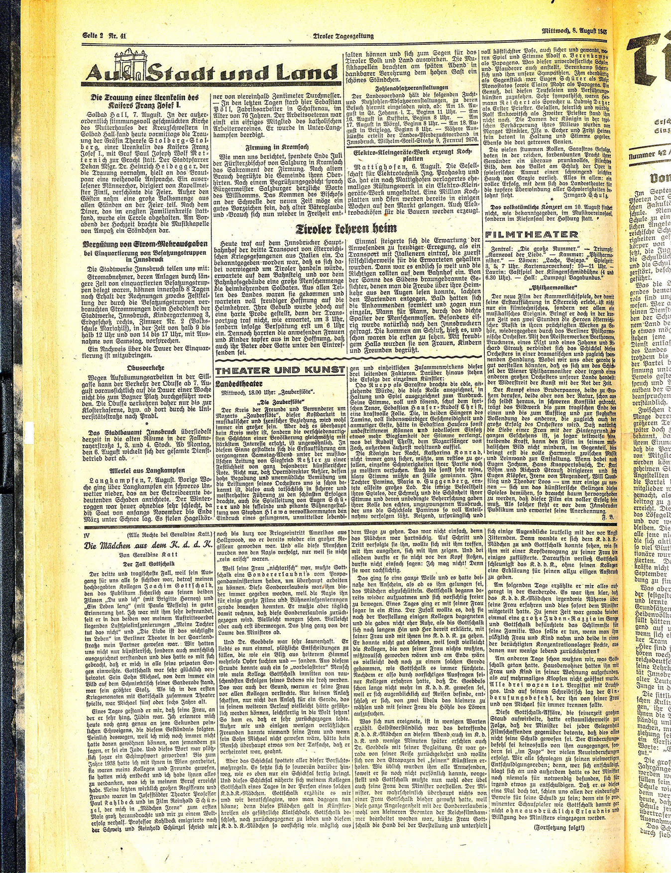 Wie man uns berichtet, spendete Ende Juli der Fürsterzbischof von Salzburg in Kramsach das Sakrament der Firmung. Nach altem Brauch begrüßte die Gemeinde ihren Oberhirten. Nach einem Begrüßungsgedicht sprach Bürgermeister Salzburger herzliche Worte des Willkomms. Das Kommen des Bischofs an der Schwelle der neuen Zeit möge ein gutes Vorzeichen sein, daß alter Väterglaube und =Brauch sich nun wieder in Freiheit ent