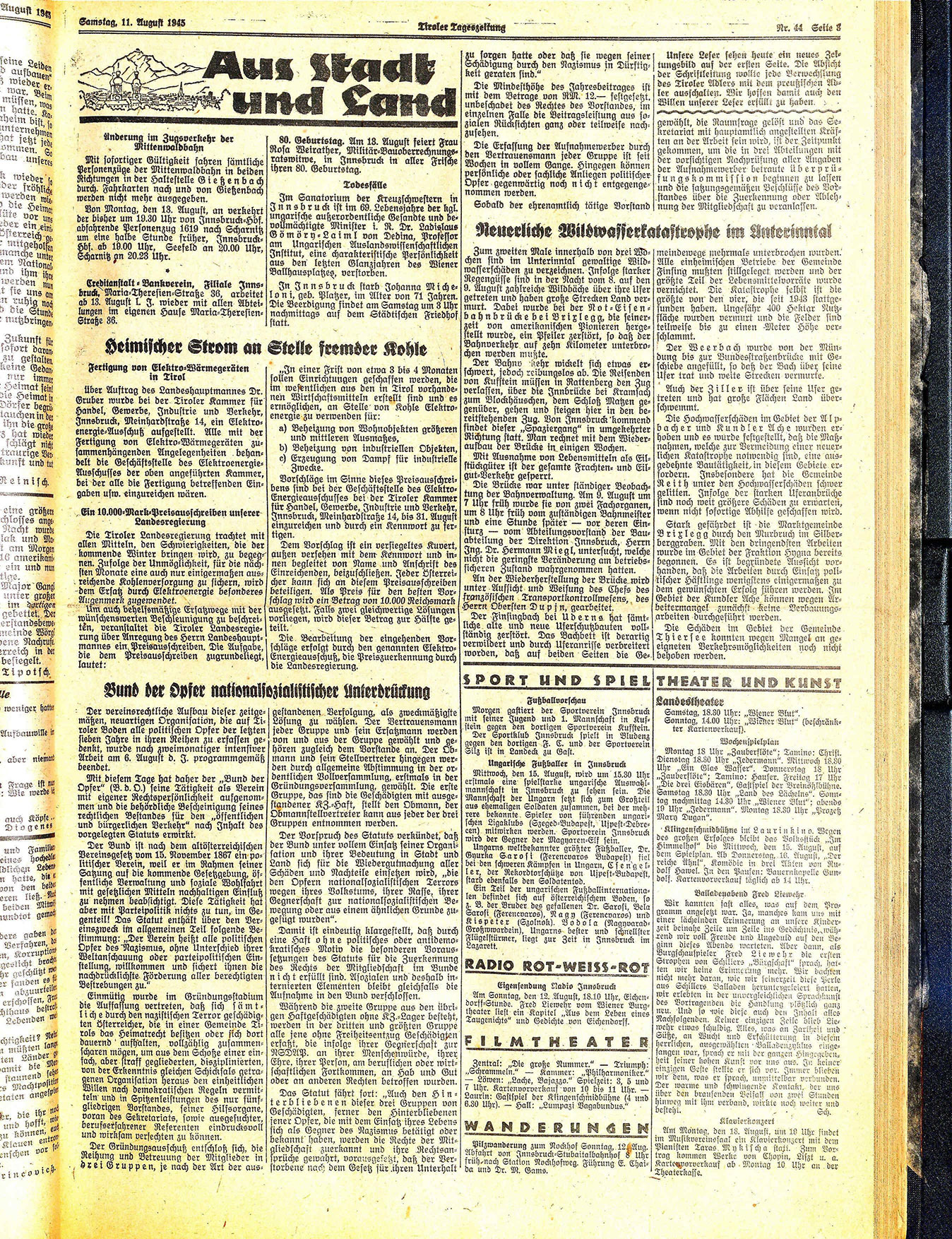 Der vereinsrechtliche Aufbau dieser zeitgemäßen, neuartigen Organisation, die auf Tiroler Boden alle politischen Opfer der letzten sieben Jahre in ihren Reihen zu erfassen gedenkt, wurde nach zweimonatiger intensiver Arbeit am 6. August d. J. programmgemäß beendet.