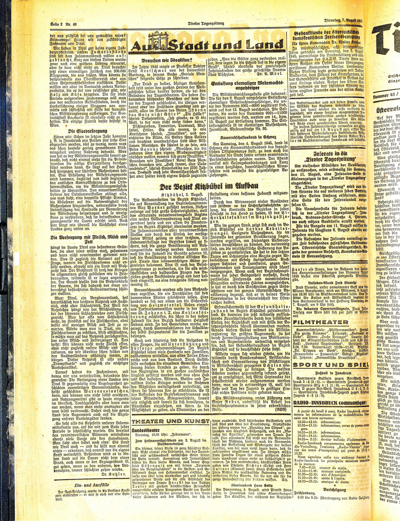 Die Aufbauarbeiten im Bezirk Kitzbühel, die auf Veranlassung des Bezirkshauptmannes Max Werner geführt werden, stießen anfangs auf sehr große Schwierigkeiten, weil das abtretende verantwortungslose Regime eine wahre Völkerwanderung nach Tirol angeardnet hatte und vor allem die Fremdenorte im Bezirk Kitzbühel überlaufen wurden. Im Zusammenwirnen aller verantwortlichen Stellen und durch den Einsatz der verfügbaren Mittel gelang es aber trotzdem, die Lebensmittellage des Bezirkes soweit zu sichern, daß die ganze Bevölkerung mit Nahrungsmitteln versorgt werden konnte und auch für die Zukunft die Gewähr geboten ist, daß die Bevölkerung in diesem östlichen Bezirk Tirols ihre lebenswichtigen Güter zugewiesen bekommt. Dies ist auch der Besat