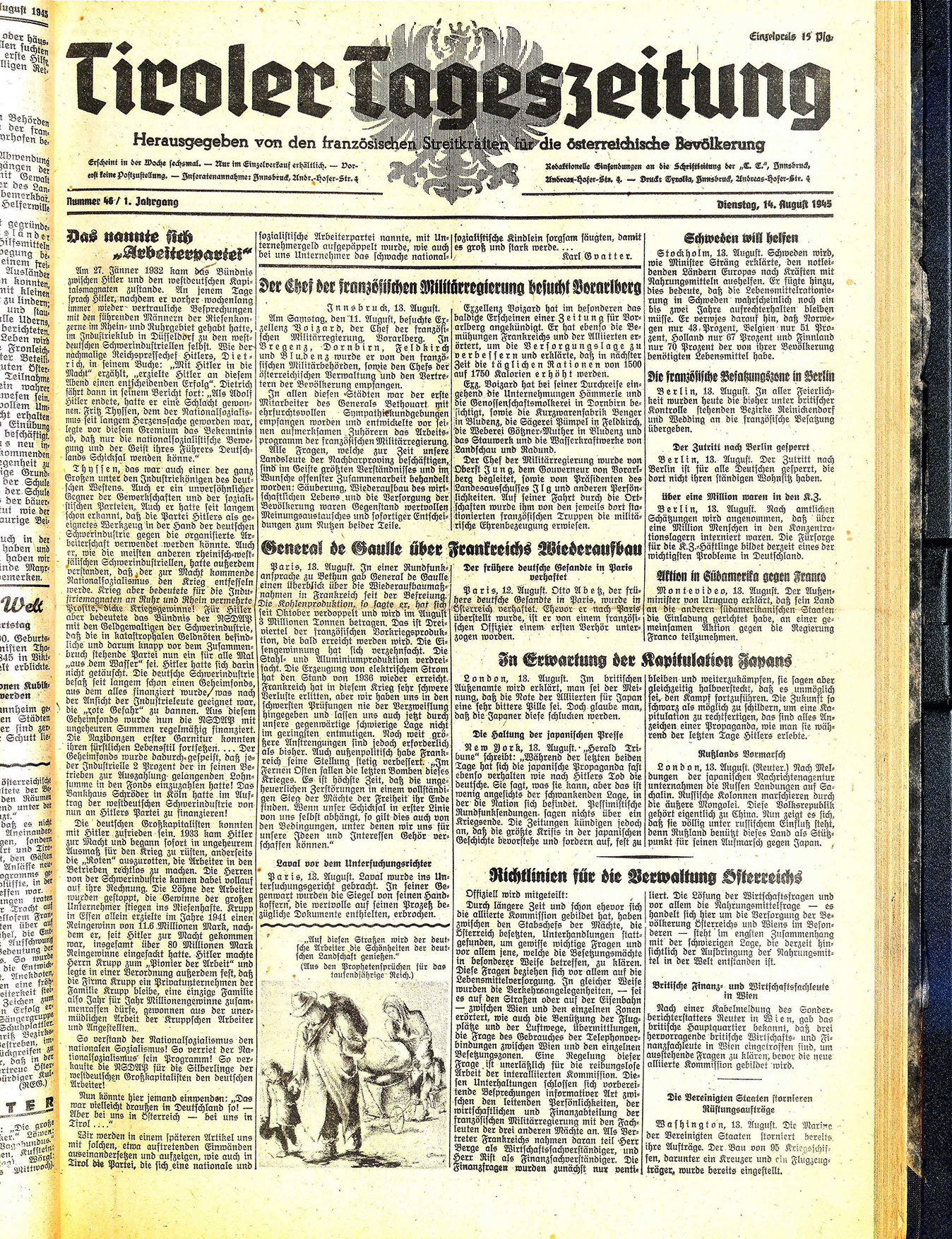 Exzellenz Voizard hat im besonderen das baldige Erscheinen einer Zeitung für Vorarlberg angekündigt. Er hat ebenso die Bemühungen Frankreichs und der Alliierten erörtert, um die Versorgungslage zu verbessern und erklärte, daß in nächster Zeit die täglichen Rationen von 1500 auf 1750 Kalorien erhöht werden.