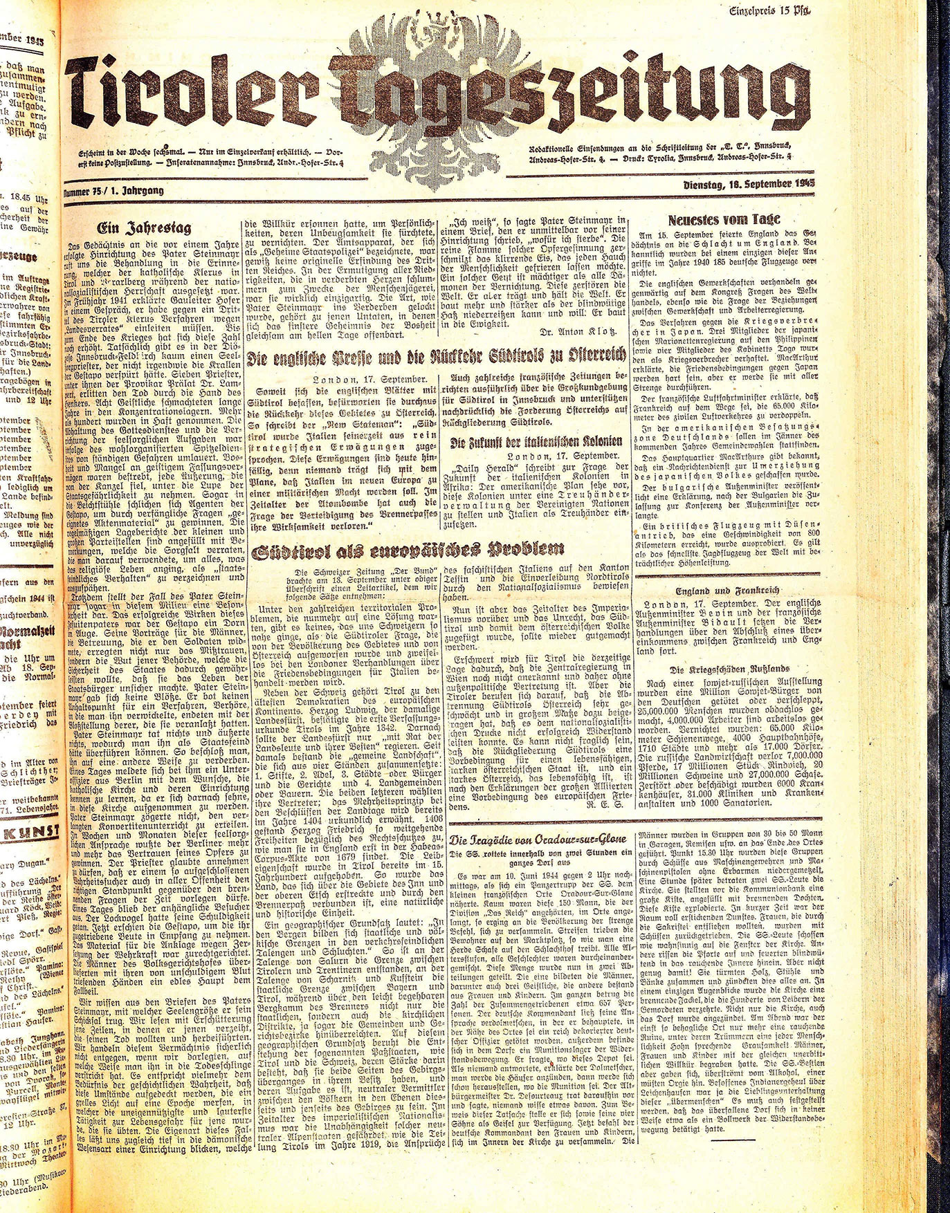 Erscheint in der Woche sechsmal. — Nur im Einzelverkauf erhältlich. — Vorerst keine Postzustellung. — Inseratenannahme: Innsbruck, Andr.-Hofer-Str. 4