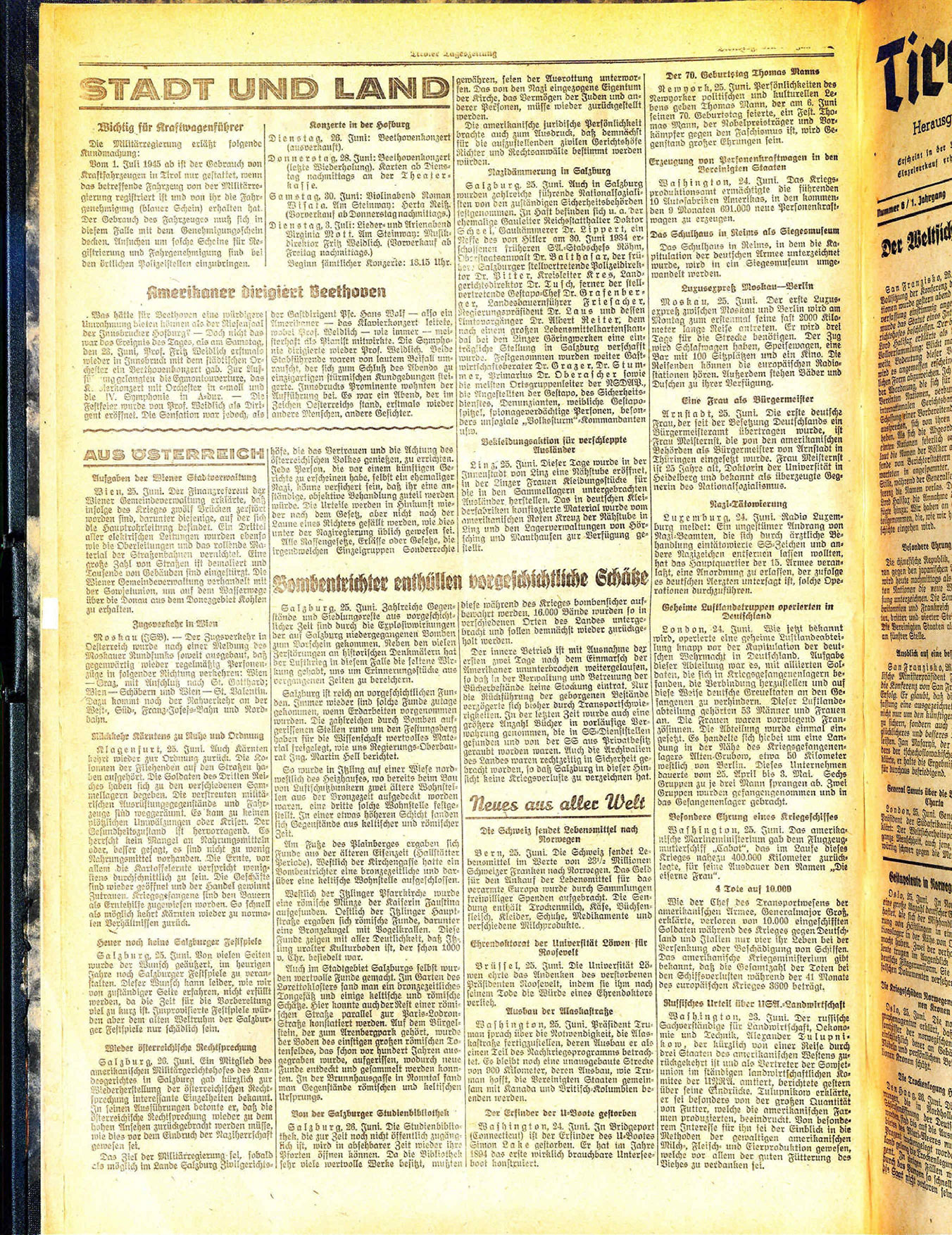 Der innere Betrieb ist mit Ausnahme der ersten zwei Tage nach dem Einmarsch der Amerikaner ununterbrochen weitergelaufen, so daß in der Verwaltung und Betreuung der Bücherbestände keine Stockung eintrat. Nur die Rückführung der geborgenen Bestände verzögerte sich bisher durch Transportschwierigkeiten. In der letzten Zeit wurde auch größere Anzahl Bücher in vorläufige Verwahrung genommen, die in SS=Dienststellen gefunden und von der SS aus Privatbesitz geraubt worden waren. Auch die Archivalien des Landes waren rechtzeitig in Sicherheit bracht worden, so daß Salzburg in dieser Hinsicht keine Kriegsverluste zu verzeichnen hat.