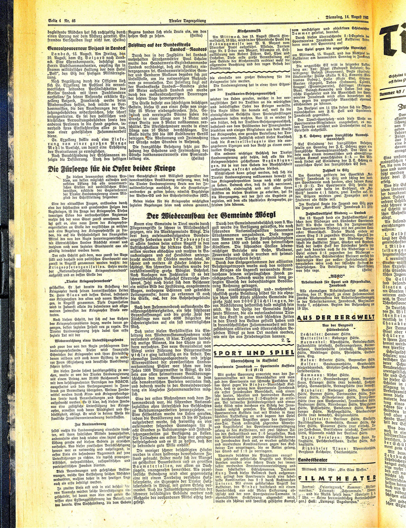 Eine ernährungsmäßig und, wohnwirtschaftlich große Belastung bildet für die ohnehin schon 5000 Köpfe zählende Gemeinde die große Zahl von 2000 Flüchtlingen, deren Rückführung hoffentlich bald möglich sein wird. An der Spitze der Gemeinde stehen heute Männer, die als vaterlandstreue Tiroler ihre Kraft in guten und schlechten Zeiten in den Dienst des Volkes gestellt haben und in freundschaftlicher Zusammenarbeit mit den zuständigen alliierten und österreichischen Behörden Wörgl zu dem Ort machen werden, wie wir ihn aus Friedenszeiten kennen.