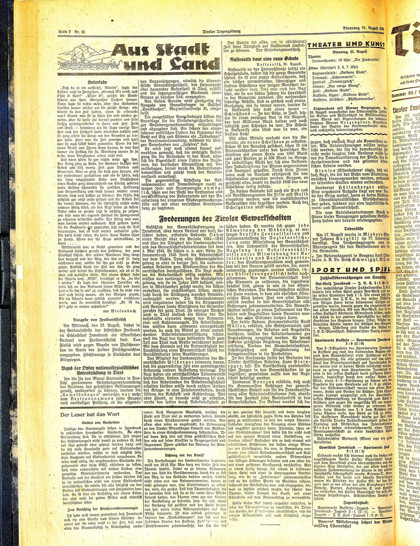 ausbezahlt werden. Die Arbeiterkammer wird einzutreten haben für die Kriegsopfer und Rentner sowie Einrichtung der Gewerbegerichte für ganz Tirol. In wenigen Wochen wird in Tirol vielfach ein Abbau der Arbeitskräfte eintreten wegen des Rohmaterial= und Kohlenmangels. Die Arbeitsuchenden müssen dann anderswo untergebracht werden, da auch die Mittel zu einer ausreichenden Arbeitslosenunterstützung fehlen, weil die Nazi das dazu bestimmte Geld zum Teil aus Tirol nach Berlin verschleppt haben! Mit dem Hinweis auf die Notwendigkeit der Durchführung einer Planwirtschaft schloß der Berichterstatter seine Ausführungen.
