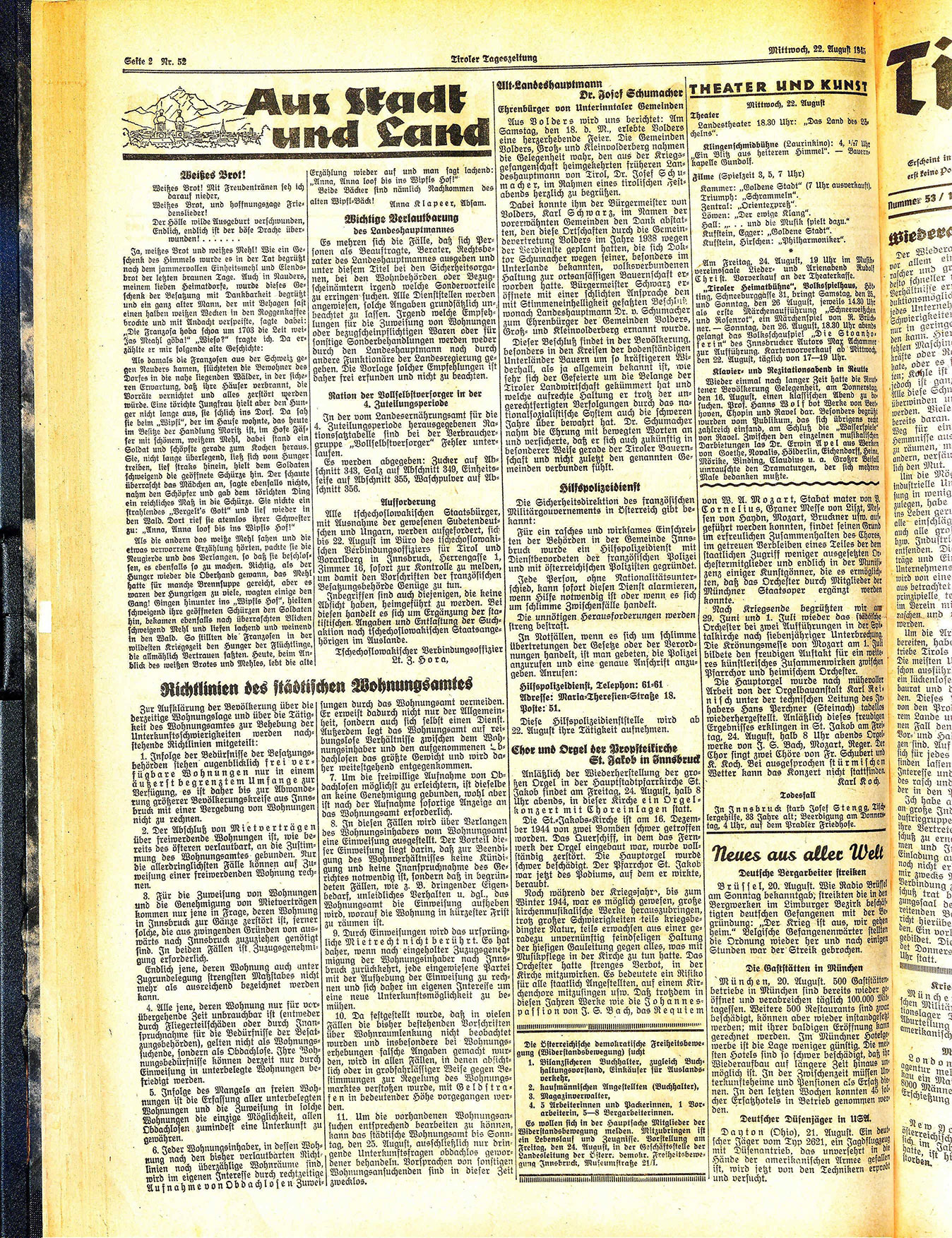 Alle tschechoslowakischen Staatsbürger, mit Ausnahme der gewesenen Sudetendeutschen und Ungarn, werden aufgefordert, sich bis 22. August im Büro des tschechoslowakischen Verbindungsoffiziers für Tirol und Vorarlberg in Innsbruck, Herrengasse 1, Zimmer 16, sofort zur Kontrolle zu melden, um damit den Vorschriften der französischen Besatzungsbehörde Genüge zu tun.