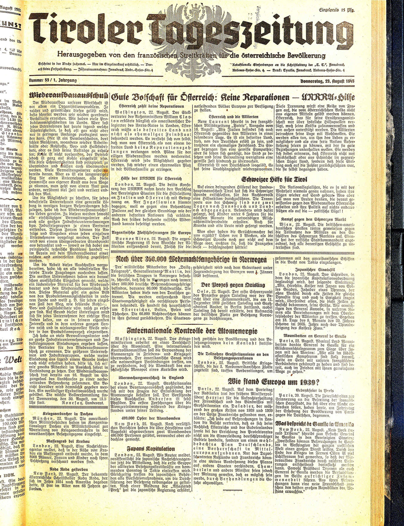 Erscheint in der Woche sechsmal. — Nur im Einzelverkauf erhältlich. — Dorerst keine Postzustellung. — Inseratenannahme: Innsbruck, Andr.-Hofer-Str. 4