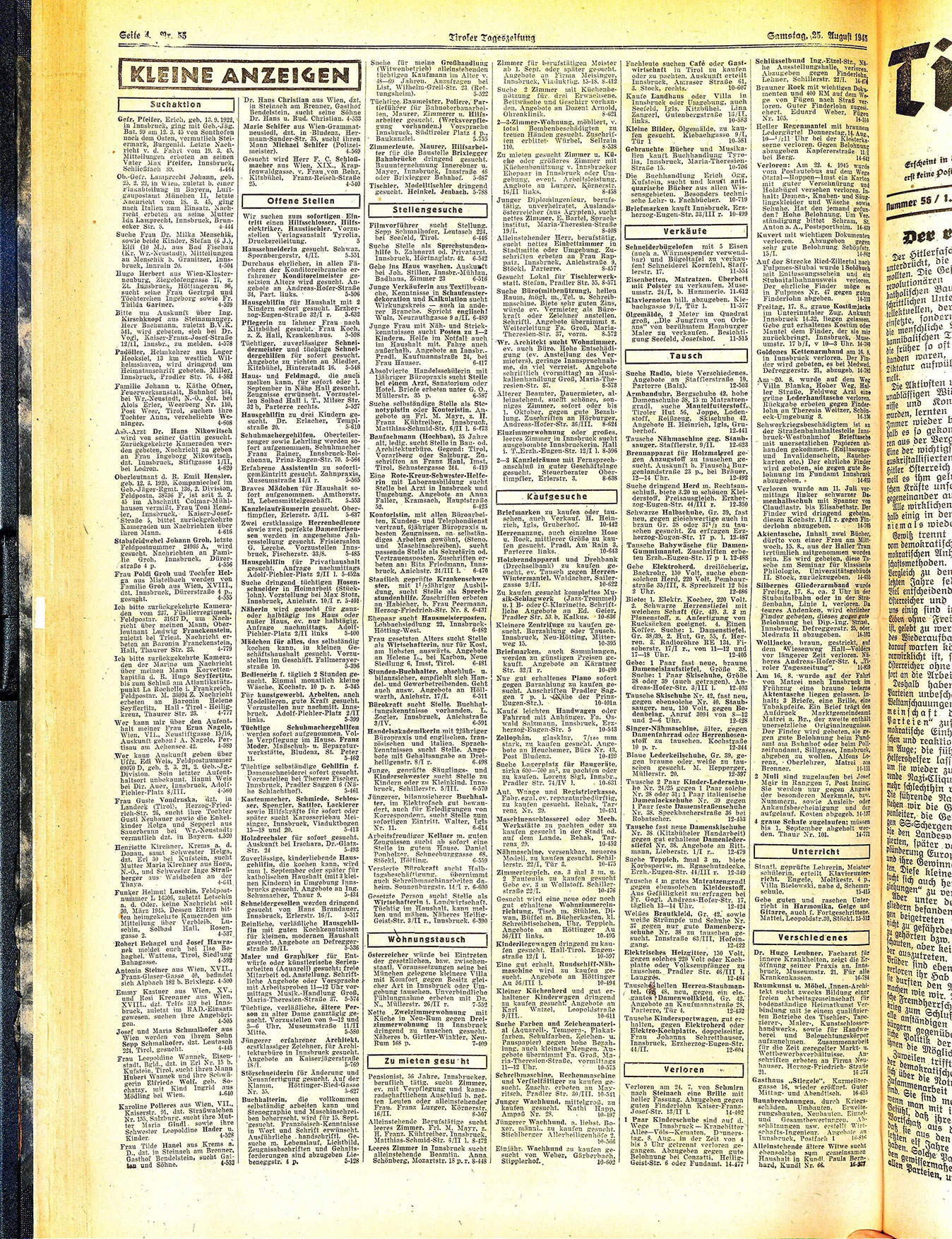 Am 16. 8. wurde auf der Fahrt von Matrei nach Innsbruck im Frühzug eine braune lederne Aktentasche liegen gelassen, Inhalt: 3 Briefe, eine Brille, eine Tabakpfeife. Ein Brief trägt den Aufdruck Marktgemeindeamt Matrei a. Br., der zweite enthält unersetzliche Originalzeugnisse. Der Finder wird gebeten, sie gegen gute Belohnung beim Fundamt am Bahnhof oder beim Polizeifundamt, Sillgasse, Innsbruck, abgeben zu wollen. Alfons Lorenz, - Oberlehrer, Matrei am Brenner. 14=111