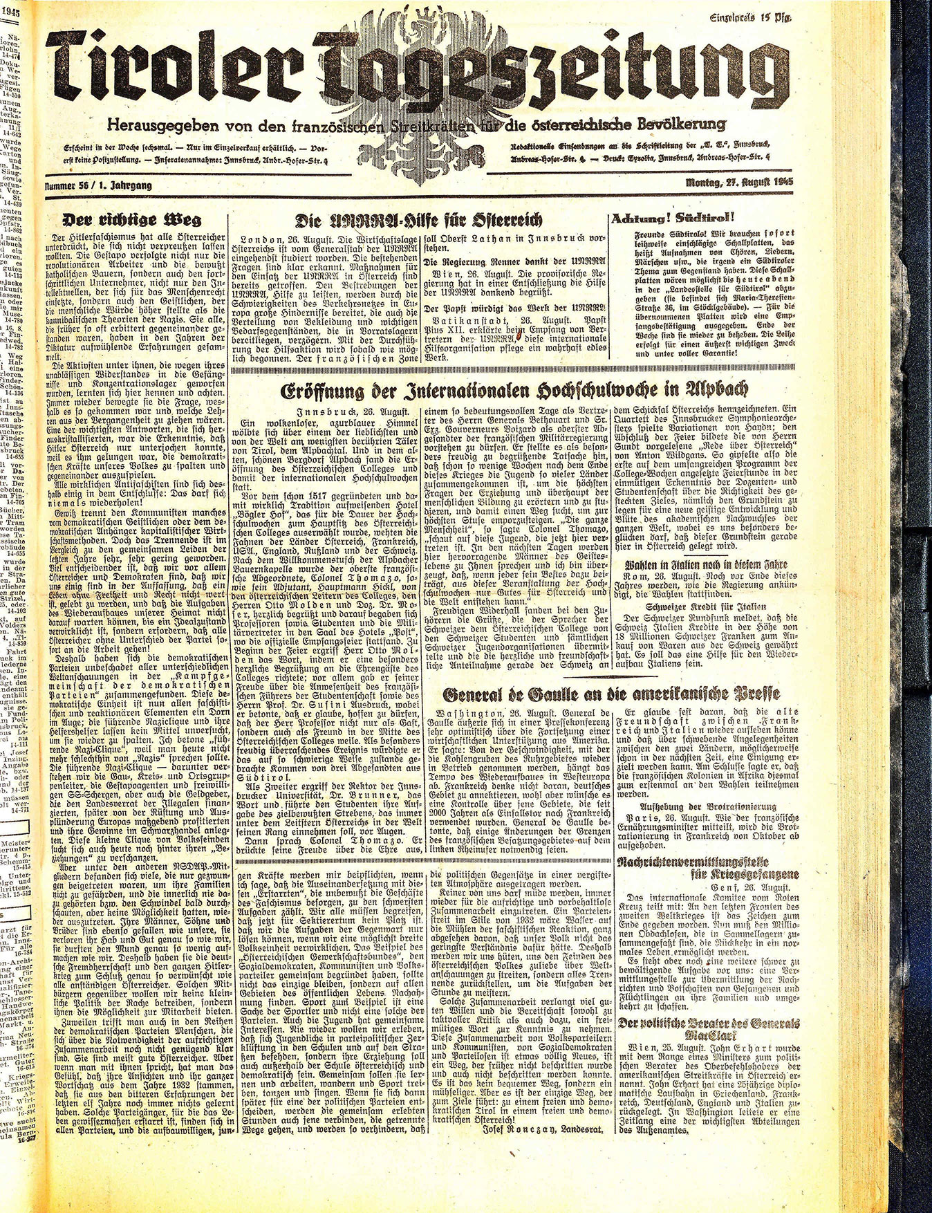 Erscheint in der Woche sechsmal. — Nur im Einzelverkauf erhältlich. — Vorerst keine Postzustellung. — Inseratenannahme: Innsbruck, Undr.-Hofer-Str. 4
