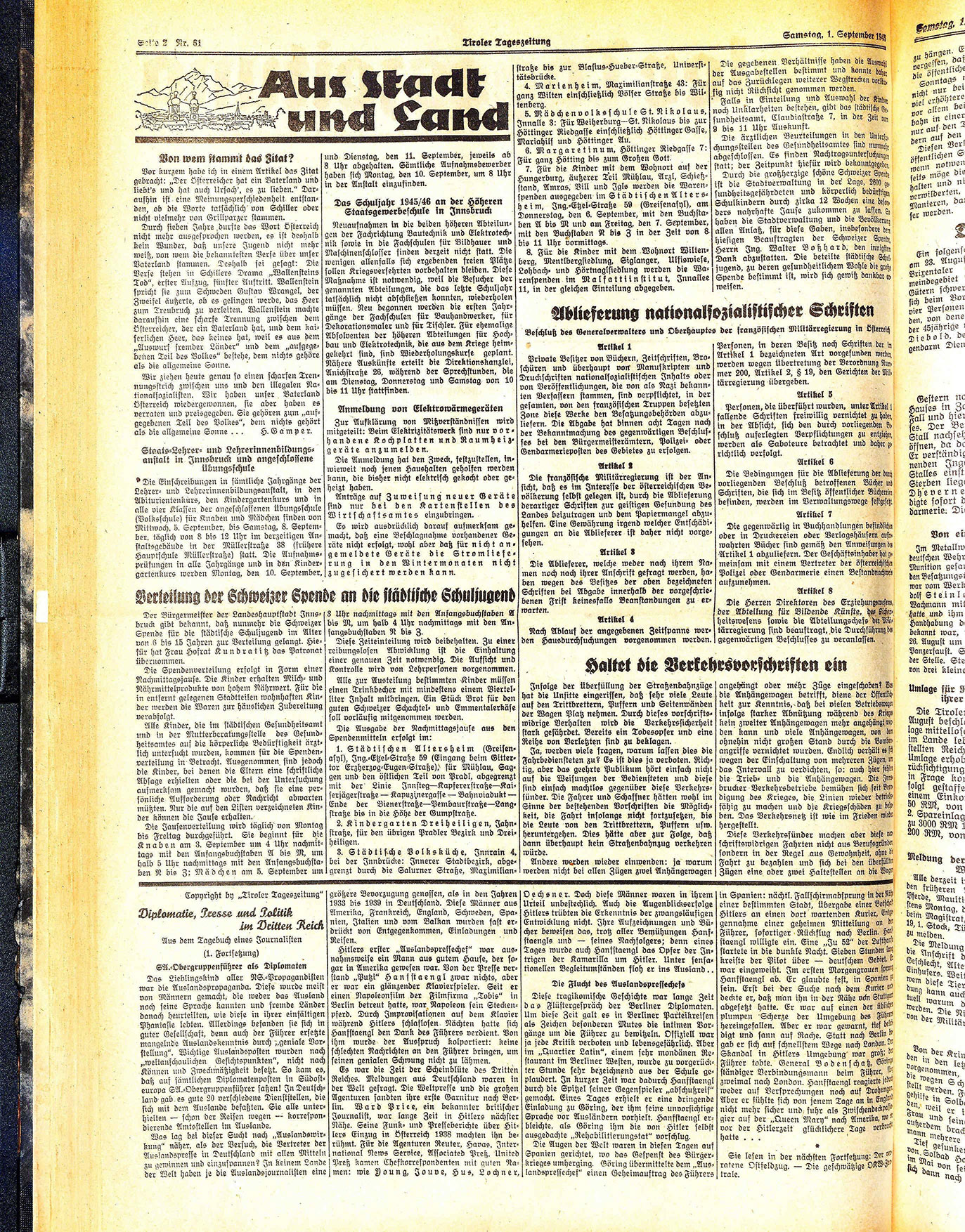 Private Besitzer von Büchern, Zeitschriften, Broschüren und überhaupt von Manuskripten und Druckschriften nationalsozialistischen Inhalts oder von Veröffentlichungen, die von als Nazi bekannten Verfassern stammen, sind verpflichtet, in der gesamten, von den französischen Truppen besetzten Zone diese Werke den Besatzungsbehörden abzuliefern. Die Abgabe hat binnen acht Tagen nach der Bekanntmachung des gegenwärtigen Beschlusses bei den Bürgermeisterämtern, Polizei= oder Gendarmerieposten des Gebietes zu erfolgen.