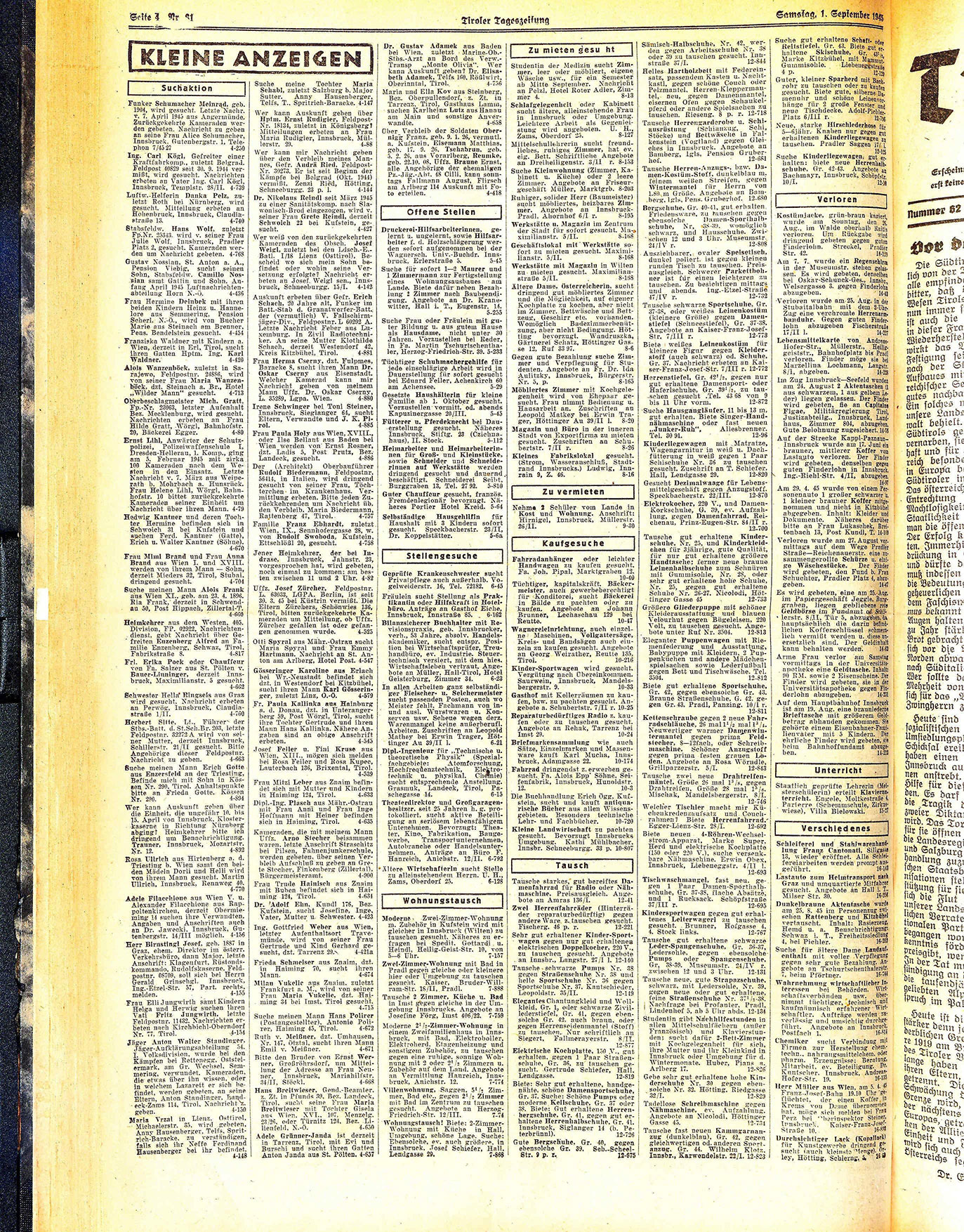 Auskunft erbeten über Gefr. Erich Schach, 20 Jahre alt, Funker im Batt.-Stab d. Granatwerfer-Batt. der (vermutlich) V. Fallschirmjäger-Div., Feldpostnr. L 60292 A. Letzte Nachricht Feber aus Luxemburg. In Zivil Radiotechniker. An seine Mutter Klothilde Schach, derzeit Westendorf 42. Kreis Kitzbühel, Tirol. 4-881 Frau Herma Cserny, dzt. Fulpmes, Baracke 8, sucht ihren Mann Dr. Oskar Cserny aus Eisenstadt. Welcher Kamerad kann mir Nachricht geben von meinem Mann Uffz. Dr. Oskar Cserny, L. 35289, Lgpa. Wien. 4-880