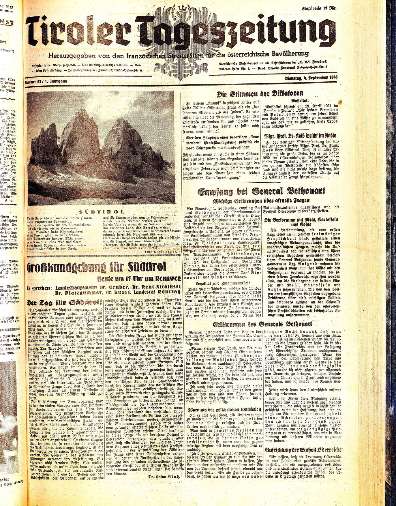 Die Aufrichtung der Brennergrenze war im kontinentalen Europa eine der sichtbarsten Ausdrucksformen für eine Aera des Imperialismus. Die furchtbaren Ereignisse des abgelaufenen Jahrzehnts haben diesen grausamen, menschenfeindlichen Irrtum gerichtet. Was bleibt nach dieser Katastrophe anderes übrig als die Zusammenarbeit, die Harmonie der Völker= und Staatengemeinschaften mit allem guten Willen und aller ernsten Kraft anzustreben? In einem Augenblick, da uns die so ermunternde Botschaft des Weltsicherheitsvertrages beglückt, ist die Brennergrenze zu einem Anachronismus geworden. Die Sicherung des Friedens vor Störungen verlangt ihre Beseitigung. Wir begehren nicht fremden Besitz. Wir wollen nichts anderes als unser Land, dem geschichtliche