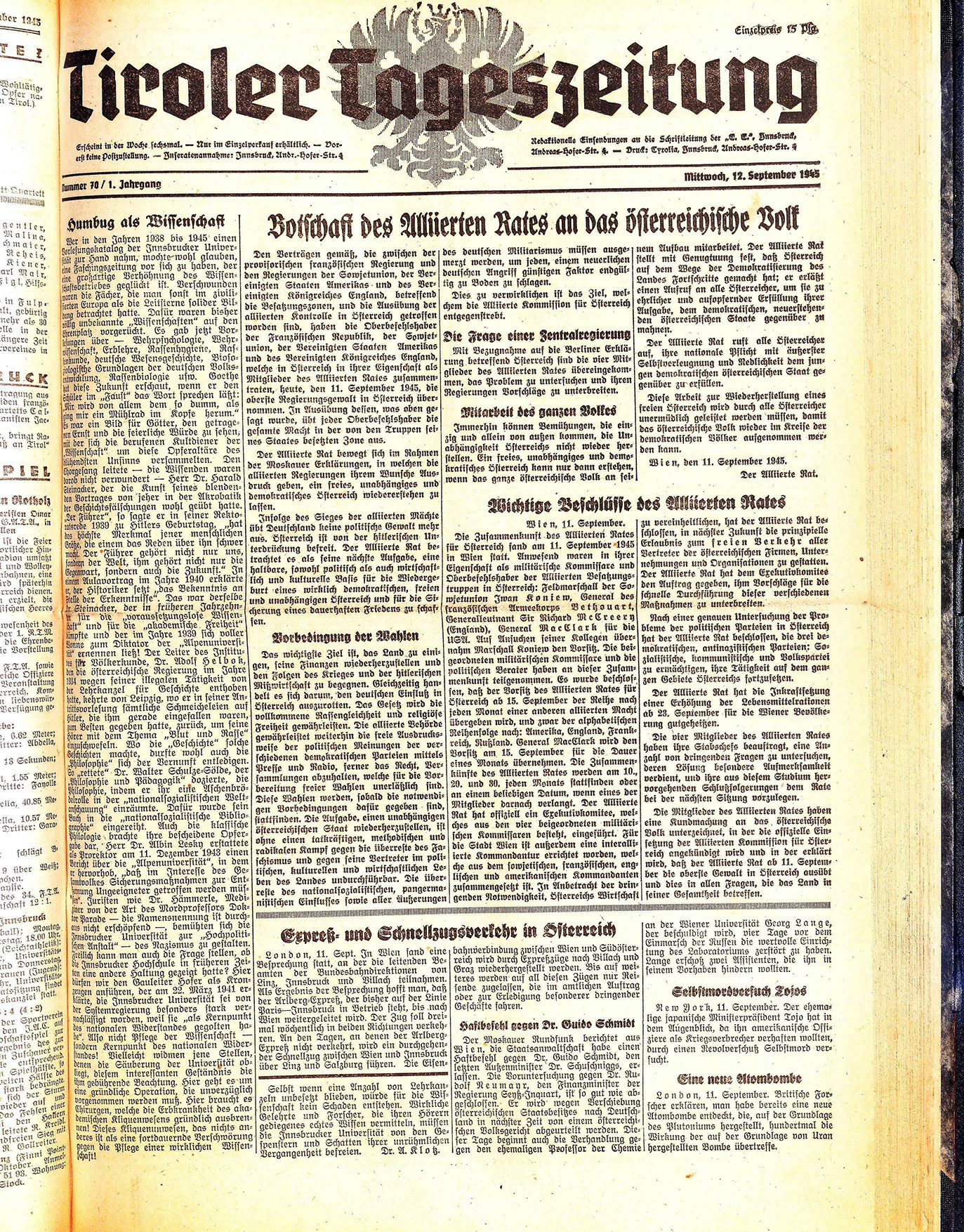 Nach einer genauen Untersuchung der Probleme der politischen Parteien in Österreich hat der Alliierte Rat beschlossen, die drei demokratischen, antinazistischen Parteien: Sozialistische, kommunistische und Volkspartei zu ermächtigen, ihre Tätigkeit auf dem ganzen Gebiete Österreichs fortzusetzen.