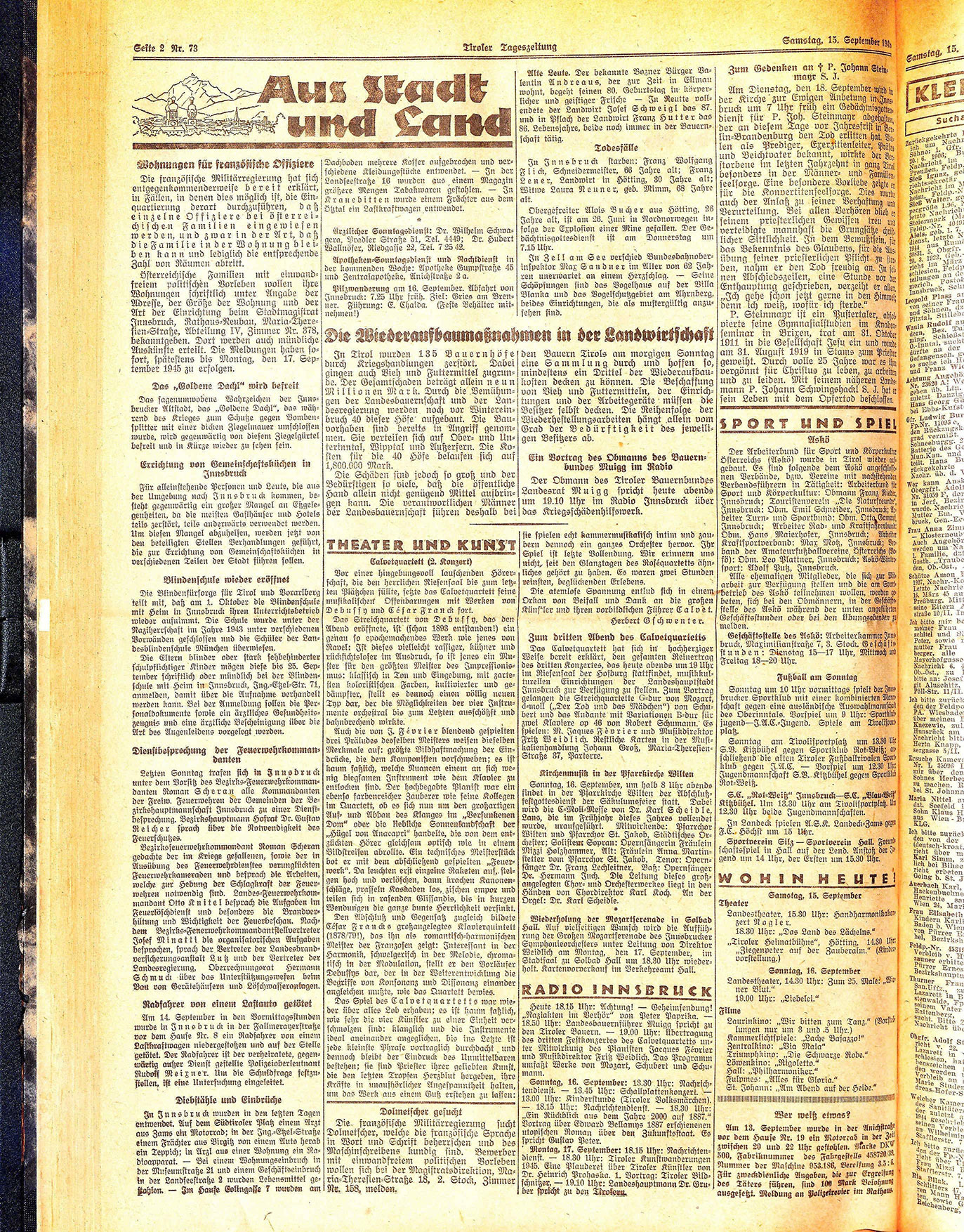 Für alleinstehende Personen und Leute, die aus der Umgebung nach Innsbruck kommen, besteht gegenwärtig ein großer Mangel an Eßgelegenheiten, da die meisten Gasthäuser und Hotels teils zerstört, teils anderwärts verwendet werden. Um diesen Mangel abzuhelfen, werden jetzt von den beteiligten Stellen Verhandlungen geführt, die zur Errichtung von Gemeinschaftsküchen in verschiedenen Teilen der Stadt führen sollen.