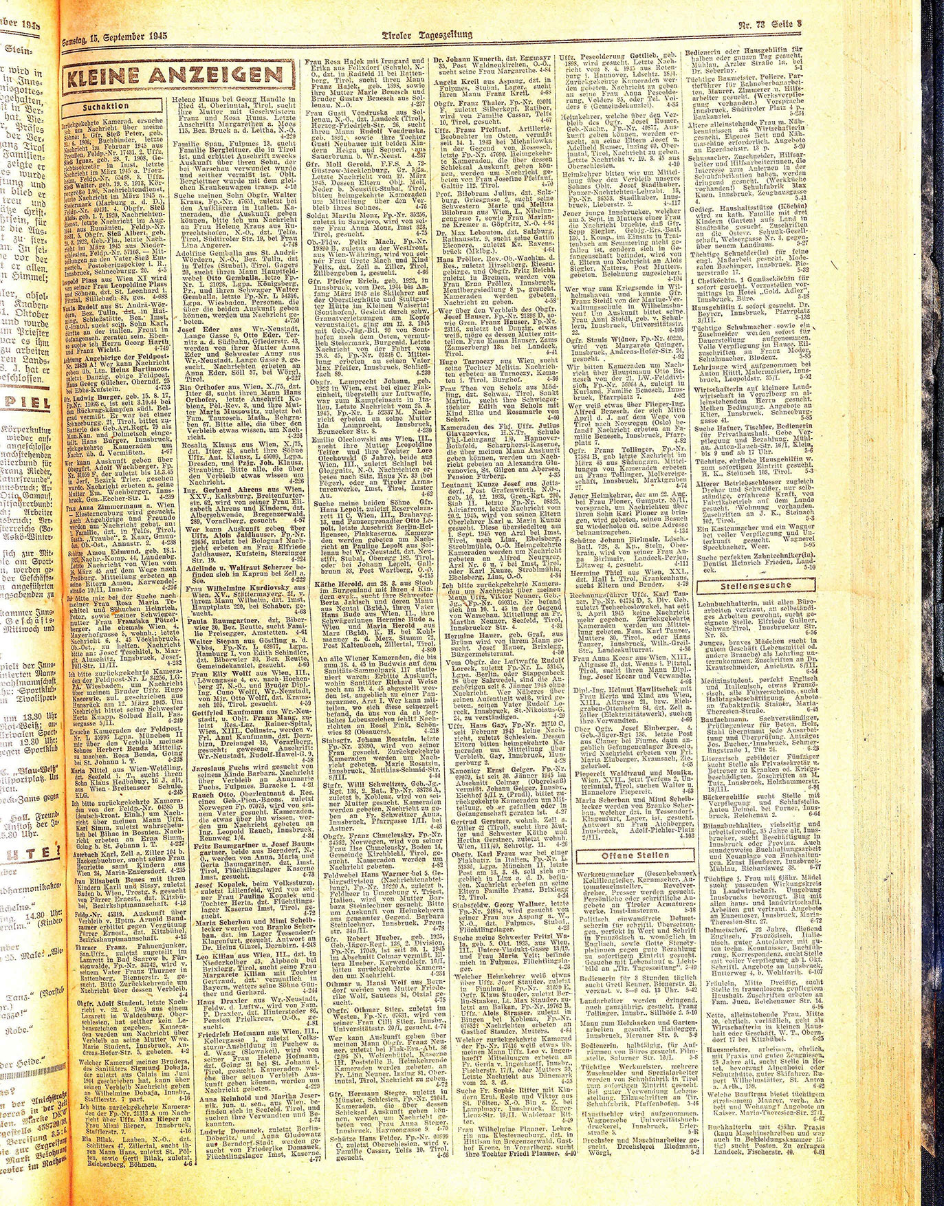 Jaroslaus Fuchs wird gesucht von seinem Kinde Barbara. Nachricht über Verbleib an Annemarie Fuchs, Fulpmes, Baracke 1. 4-21 Rauch Otto, Oberleutnant d. Res. eines Geb.-Pion.-Baons, zuletzt Norwegen Fp. 07075, wird von seinem Vater gesucht. Kameraden, die etwas über ihn wissen, werden um Nachricht gebeten an Ing. Leopold Rauch, Innsbruck, Rennweg 1/4. 4-34