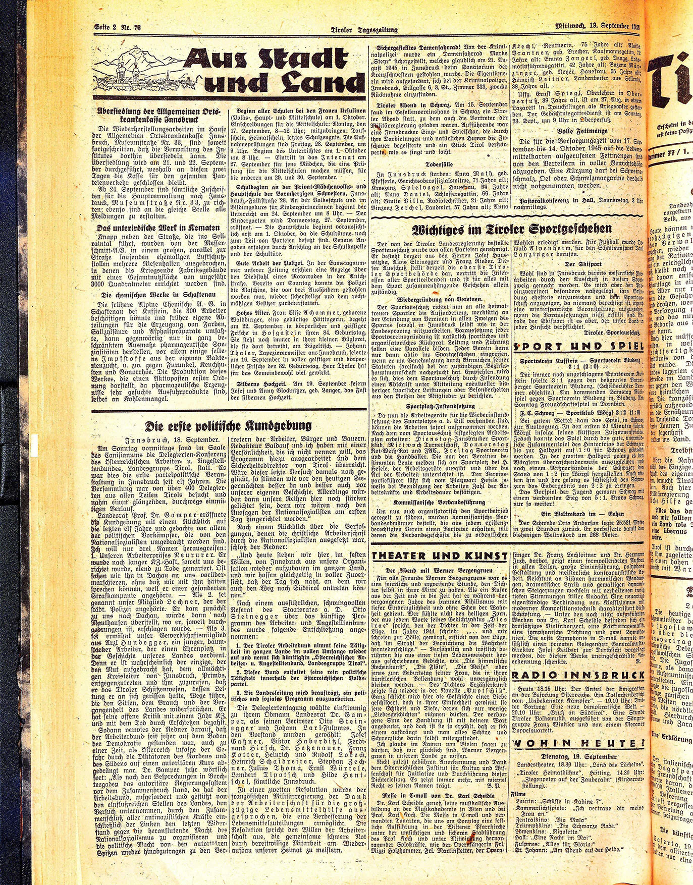 In Innsbruck starben: Anna Math, geb. Pfefferle, Gerichtsoberoffizialswitwe, 71 Jahre alt; Kreszenz Spielvogel, Hausfrau, 54 Jahre alt; Anna Daniel, Schlossersgattin, 66 Jahre alt; Giulio Villa, Radiotechniker, 21 Jahre alt; Vinzenz Ferchel, Landwirt, 57 Jahre alt; Anna