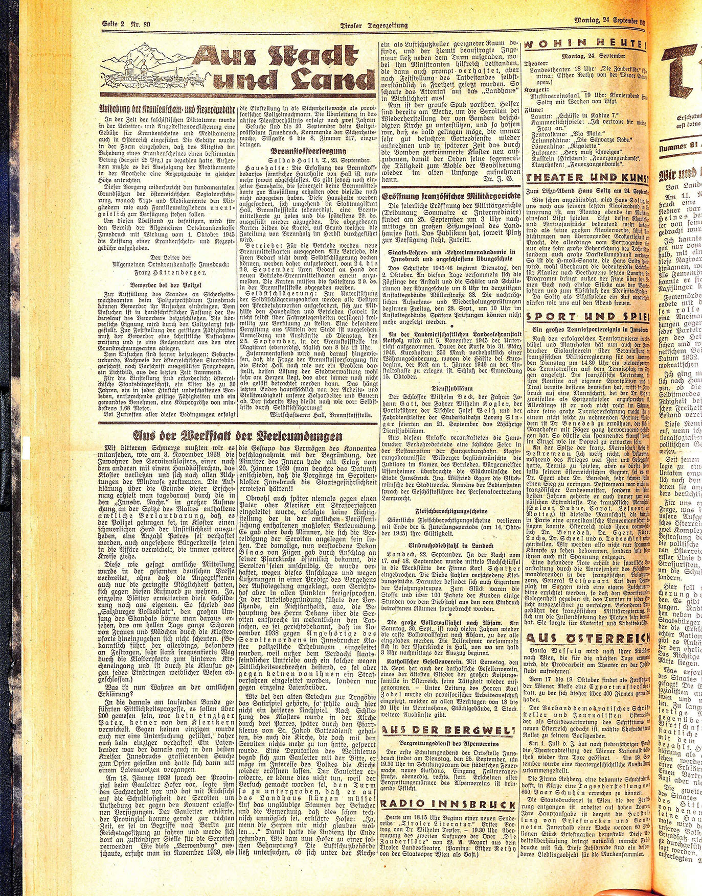 Mit bitterem Schmerze mußten wir es mitansehen, wie am 3. November 1938 die Inwohner des Servitenklosters, einer nach dem anderen mit einem Handköfferchen, das Kloster verließen und sich nach allen Richtungen der Windrose zerstreuten. Die Aufklärung über die Gründe dieser Erscheinung erhielt man tagsdarauf durch die in den „Innsbr. Nachr.“ in großer Aufmachung an der Spitze des Blattes enthaltene amtliche Verlautbarung, daß es der Polizei gelungen sei, im Kloster einen schauerlichen Herd der Unsittlichkeit auszuheben, eine Anzahl Patres sei verhaftet worden, auch angesehene Bürgerkreise seien in die Affäre verwickelt, die immer weitere Kreise ziehe.