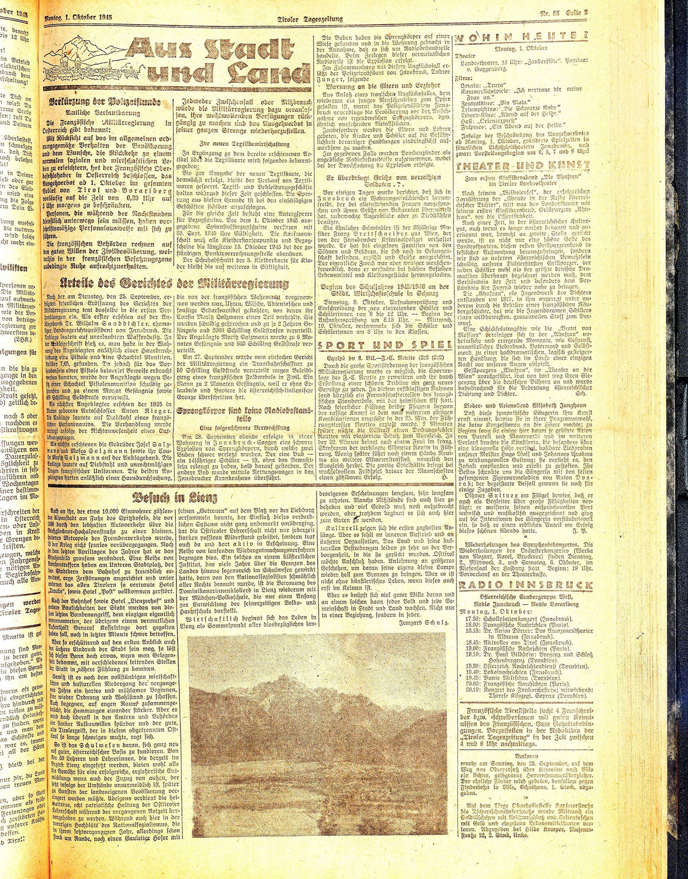 Am 27. September wurde vom einfachen Gericht der Militärregierung ein Trambahnschaffner zu 50 Schilling Geldstrafe verurteilt wegen Beleidigung eines französischen Feldwebels in Zivil. Ein Mann zu 2 Monaten Gefängnis, weil er ohne Erlaubnis und Papiere die österreichisch=italienische Grenze überschritten hat.