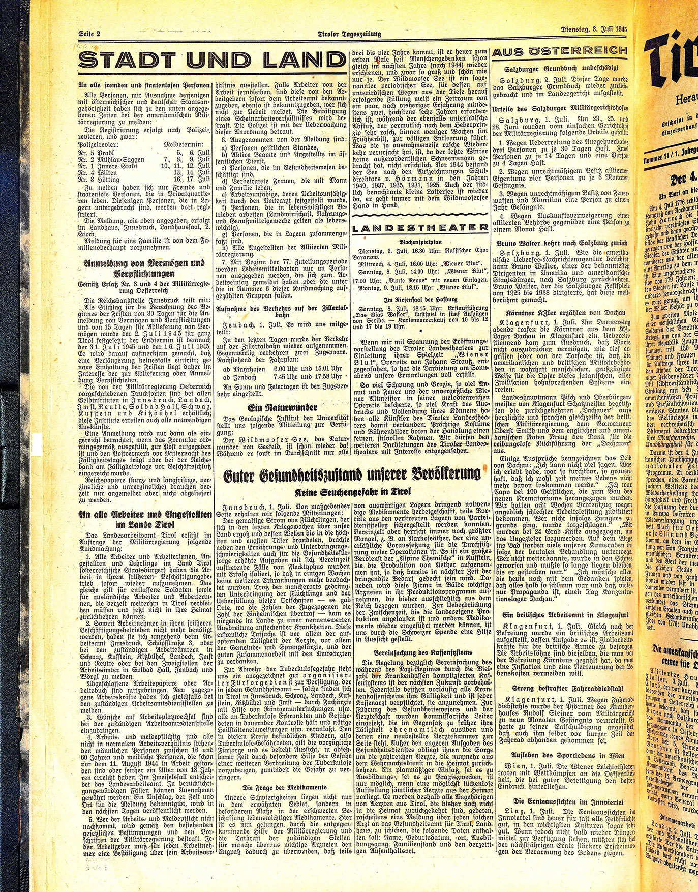 Die Reichsbankstelle Innsbruck teilt mit: Als Stichtag für die Berechnung des Beginnes der Fristen von 30 Tagen für die Anmeldung von Vermögen und Verpflichtungen und von 15 Tagen für Ablieferung von Vermögen wurde der 2. Juli 1945 für ganz Tirol festgesetzt; der Endtermin ist demnach der 31. Juli 1945 und der 16. Juli 1945. Es wird darauf aufmerksam gemacht, daß eine Verlängerung keinesfalls eintritt; genaue Einhaltung der Fristen liegt daher im Interesse der zur Ablieferung oder Anmeldung Verpflichteten.