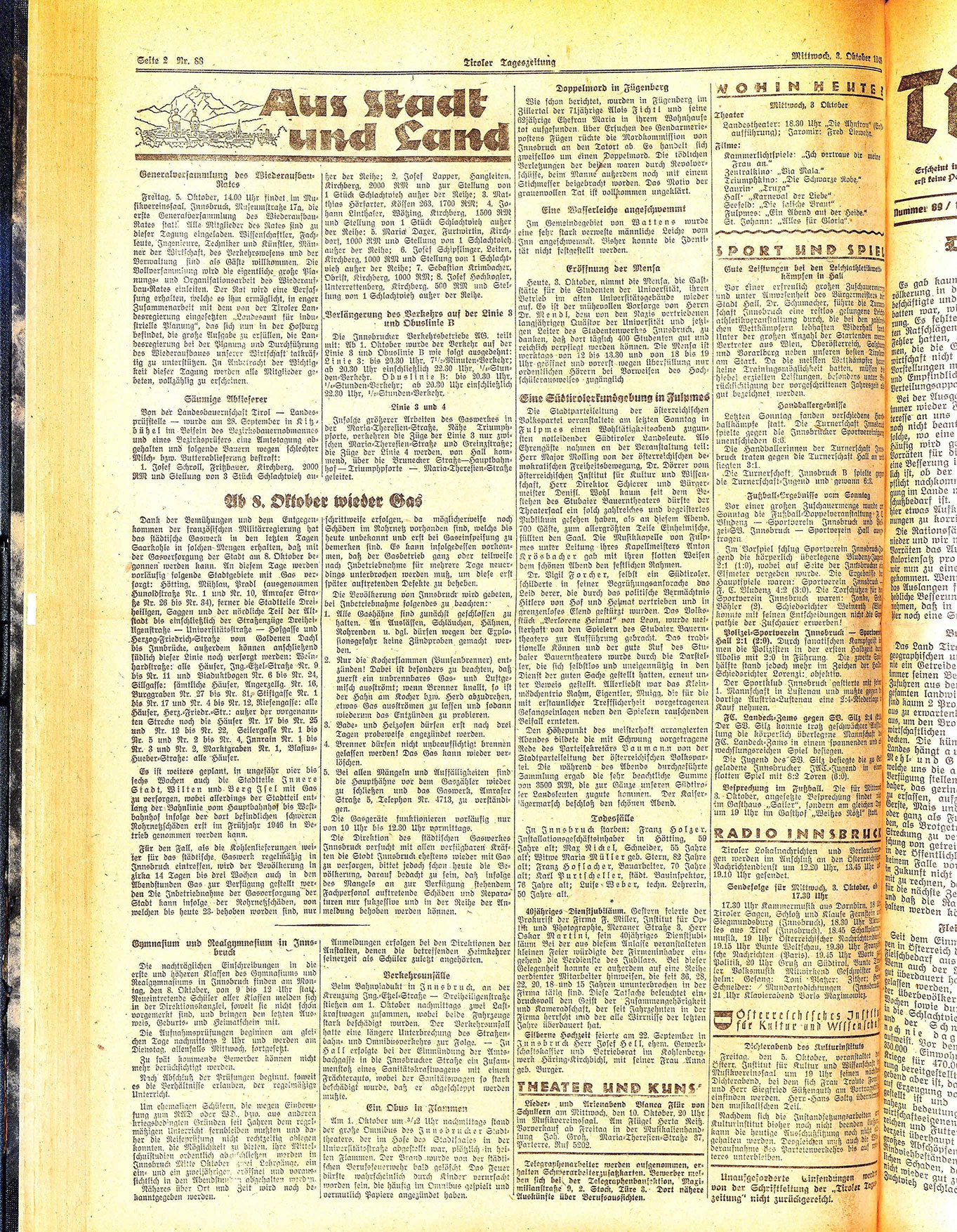 Heute, 3. Oktober, nimmt die Mensa, die Gaststätte für die Studenten der Universität, ihren Betrieb im alten Universitätsgebäude wieder auf. Es ist der mühevollen Vorsorge von Herrn Dr. Mendl, dem von den Nazis vertriebenen langjährigen Quästor der Universität und jetzigen Leiter des Studentenwerkes Innsbruck, zu danken, daß dort täglich 400 Studenten gut und reichlich verpflegt werden können. Die Mensa ist werktags von 12 bis 13.30 und von 18 bis 19 Uhr geöffnet und vorerst wegen überfüllung nur ordentlichen Hörern bei Vorweisen des Hochschülerausweises zugänglich