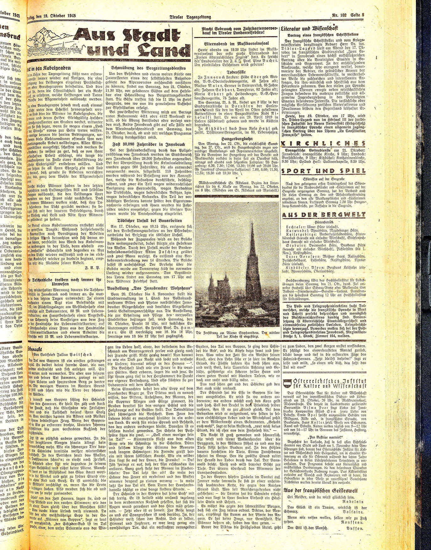 In Innsruck starben: Hilde Eder geb. Wetchy. B.=B.=Oberinspektorsgattin, 43 Jahre alt; Blasius Maier, Senner in Unterperfuß, 65 Jahre alt: Johann Gebhart, Tapezierer, 82 Jahre alt; Maria Erhart geb. Heidenberger, B.=B.=Pensionistensgattin, 75 Jahre alt.