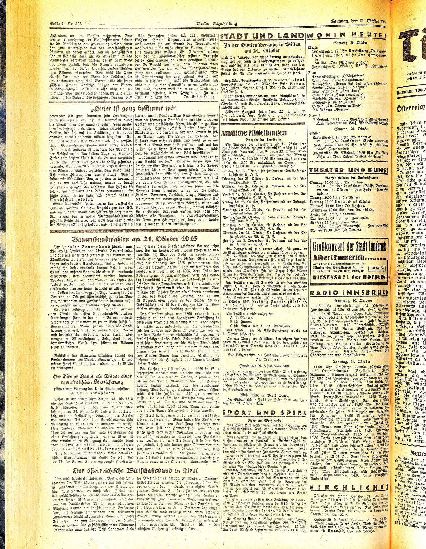 Am Kirchweihsonntag finden in allen Gemeinden Tirols die ersten Bauernbund=Generalversammlungen statt, in denen die Bauernbundmitglieder ihre Funktionäre in freier Wahl selbst bestimmen können. Damit hat die bäuerliche Bevölkerung zum erstenmal nach sieben Jahren Terror und brutaler Unterdrückung jeder freien Meinungs= und Willensäußerung Gelegenheit in echt demokratischer Weise ihre führenden Männer selbst zu wählen.