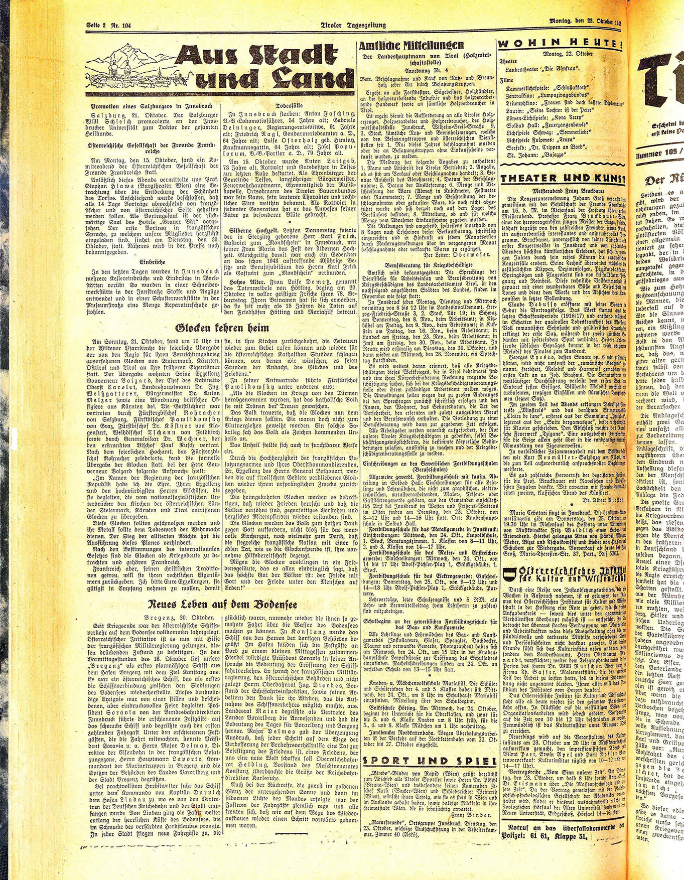 Am Sonntag, 21. Oktober, fand um 10 Uhr in der Wiltener Pfarrkirche die feierliche übergabe der von den Nazis für ihren Vernichtungskrieg ausersehenen Glocken von Steiermark, Kärnten, Osttirol und Tirol an ihre früheren Eigentümer statt. Der übergabe wohnten Seine Exzellenz Gouverneur Voizard, der Chef des Kabinetts Oberst Carolet, Landeshauptmann Dr. Ing. Weißgatterer, Bürgermeister Dr. Anton Melzer sowie eine Abordnung britischer Offiziere aus Kärnten bei. Die Geistlichkeit war vertreten durch Fürsterzbischof Rohracher von Salzburg, Fürstbischof Pawlikowsky von Graz, Fürstbischof Dr. Köstner von Klagenfurt, Weihbischof Tschann von Feldkirch sowie durch Generalvikar Dr. Wechner, der den erkrankten Bischof Paul Rusch vertrat. Nach dem feierlichen