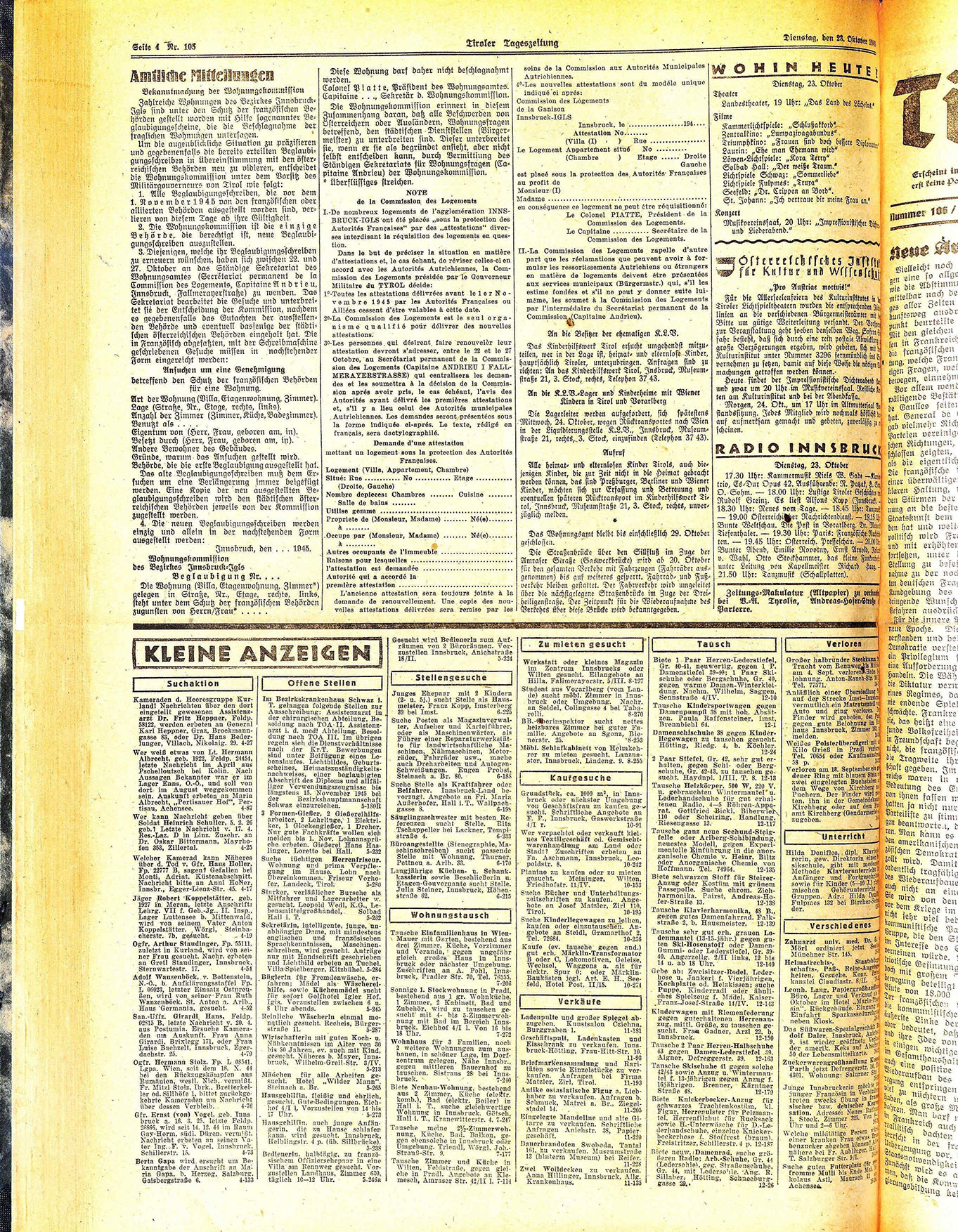 Zahlreiche Wohnungen des Bezirkes InnsbruckIgls sind unter den Schutz der französischen Behörden gestellt worden mit Hilfe sogenannter Beglaubigungsscheine, die die Beschlagnahme der fraglichen Wohnungen untersagen.