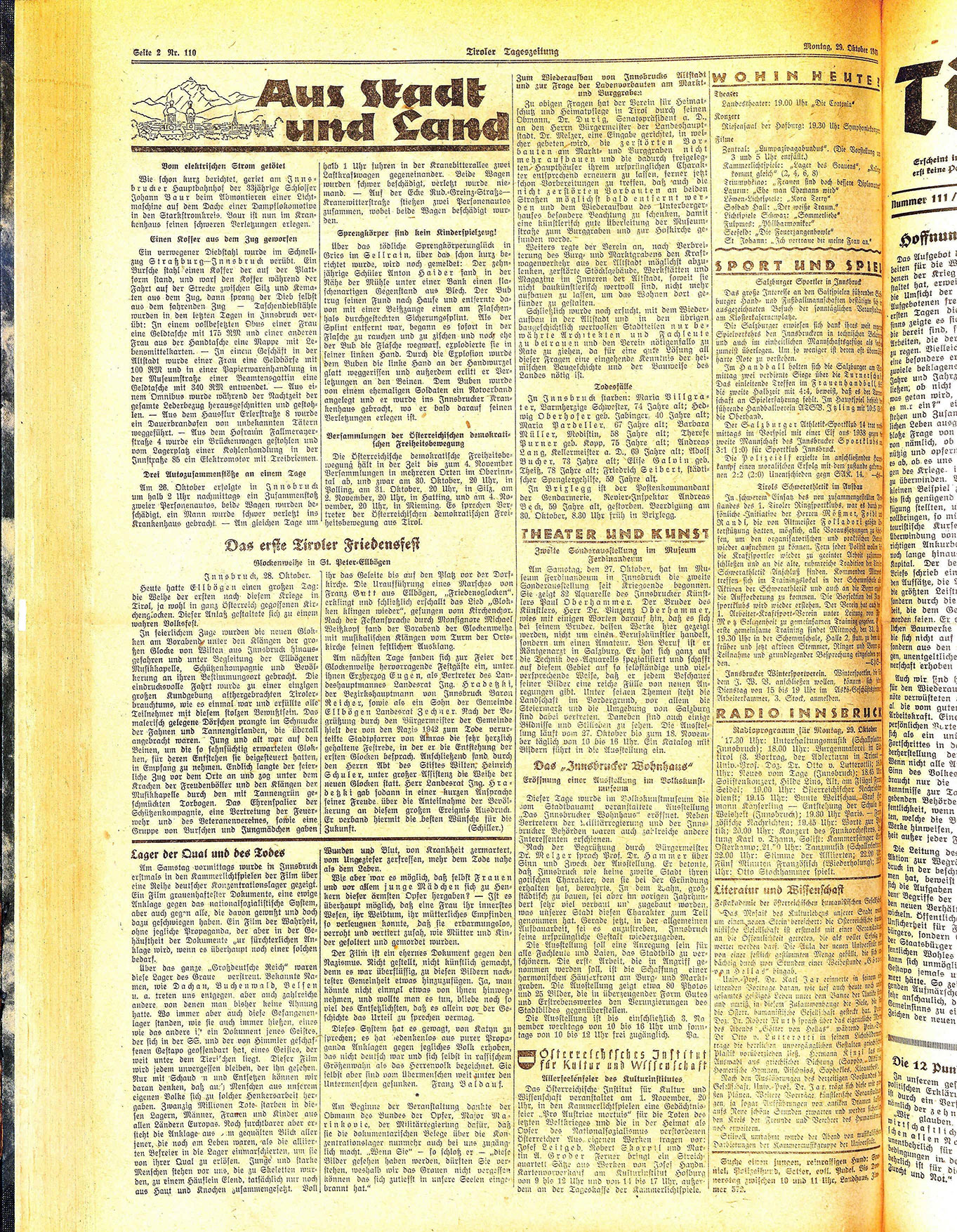 Am 26. Oktober erfolgte in Innsbruck um halb 2 Uhr nachmittags ein Zusammenstoß zweier Personenautos, beide Wagen wurden beschädigt, ein Mann wurde schwer verletzt ins Krankenhaus gebracht. — Am gleichen Tage um