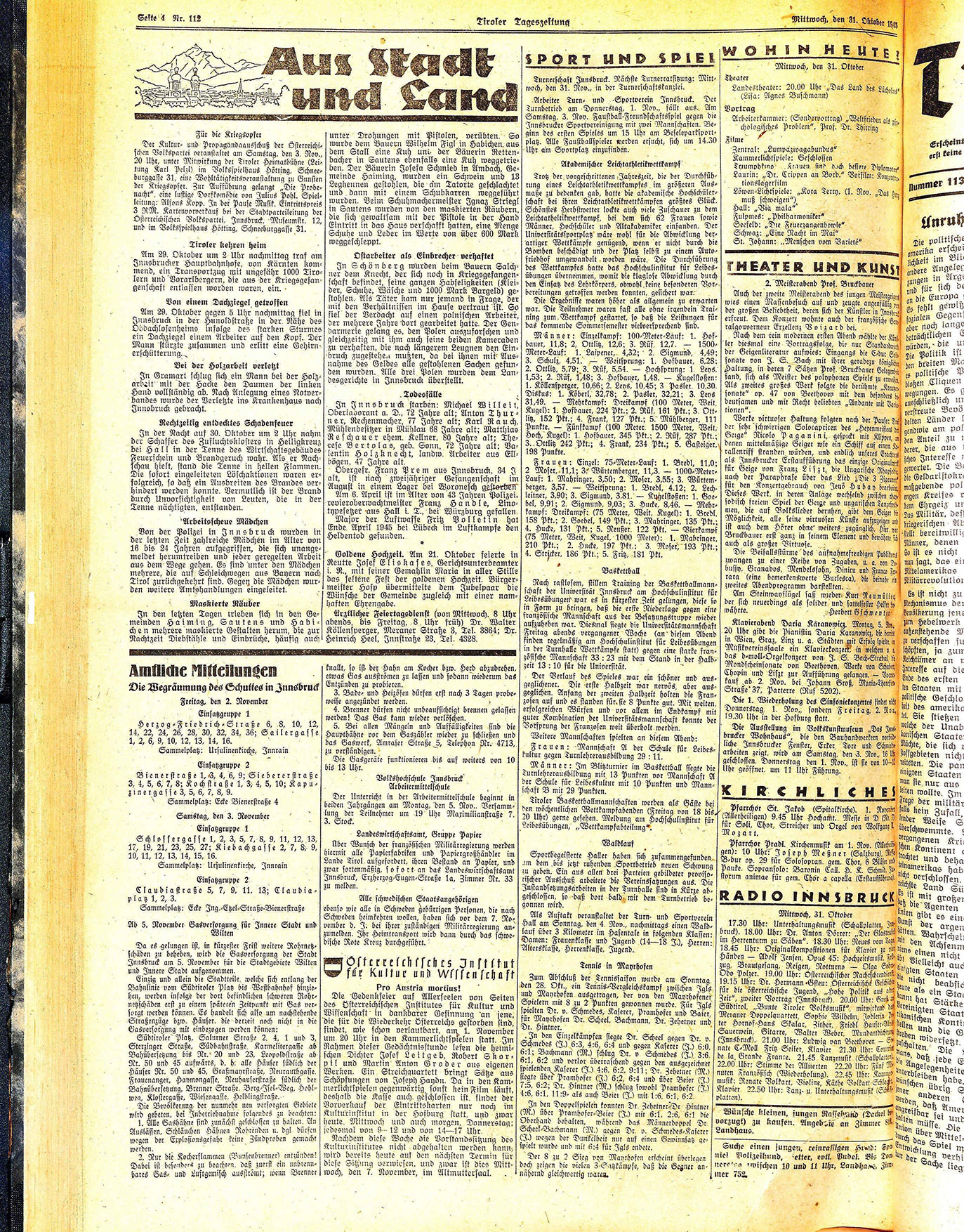 Arbeiter Turn= und Sportverein Innsbruck. Der Turnbetrieb am Donnerstag, 1. Nov., fällt aus. Am Samstag, 3. Rov. Faustball-Freundschaftsspiel gegen die Innsbrucker Sportvereinigung mit zwei Mannschaften. Beginn des ersten Spieles um 15 Uhr am Beseleparksportplatz. Alle Faustballspieler werden ersucht, sich um 14.30 Uhr am Sportplatz einzufinden.