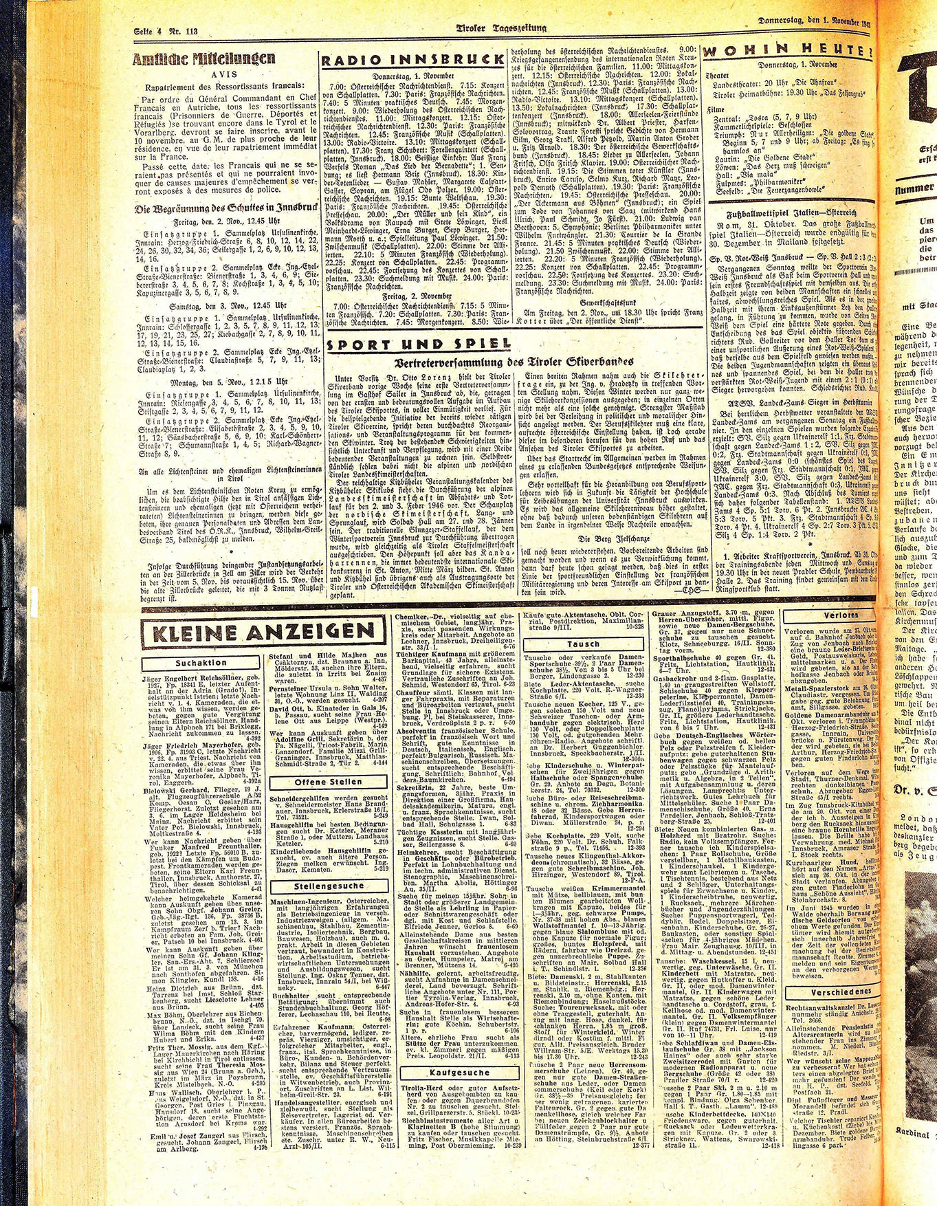 zes für die österreichischen Familien. 11.00: Mittagskonzert. 12.15: Österreichische Nachrichten. 12.00: Lokalnachrichten (Innsbruck). 12.30: Paris: Französische Nachrichten. 12.45: Französische Musik (Schallplatten). 13.00: Radio=Victoire. 13.10: Mittagskonzert (Schallplatten). 13.50: Lokalnachrichten (Innsbruck, 17.30: Schallplattenkonzert (Innsbruck). 18.00: Allerseelen=Feierstünde (Innsbruck); mitwiekend Dr. Albert Priester, HarfenSolovortrag, Traute Foresti spricht Bedichte von Hermann Gilm, Georg Trakl, Alfred Petzold, Martin Anton Groder u. Fritz Arnold. 18.30: Der österreichische Gewerkschaftsbund (Innsbruck). 18.45: Lieder zu Allerseelen, Johann Fritsch, Olfa Fritsch Klavier. 19.00: Österreichischer Nachrichtendienst. 19.15: Die Stimmen toter Künstler (Innsbruck),