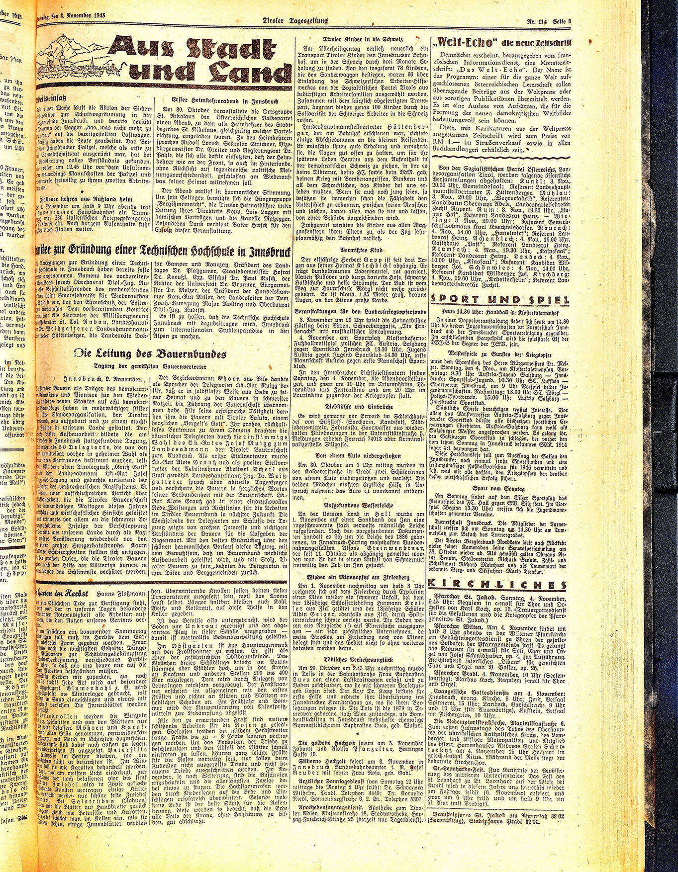 Am 1. November nachmittag um halb 3 Uhr ereignete sich auf dem Zirlerberg durch Explosion einer Mine wieder ein schwerer Unfall, bei dem der 15jährige Schlosserlehrling Hermann Kreiser aus Zirl getötet und der 13jährige Schüler Albin Geiger, ebenfalls aus Zirl, durch Splitterwirkung schwer verletzt wurde. Die Buben waren aus Neugierde (1) auf Minensuche ausgegangen — ein sehr gefährliches Unternehmen, da weite Strecken am Zirlerberg noch von Minen belegt sind und das Gebiet nicht so ohne weiteres betreten werden kann.