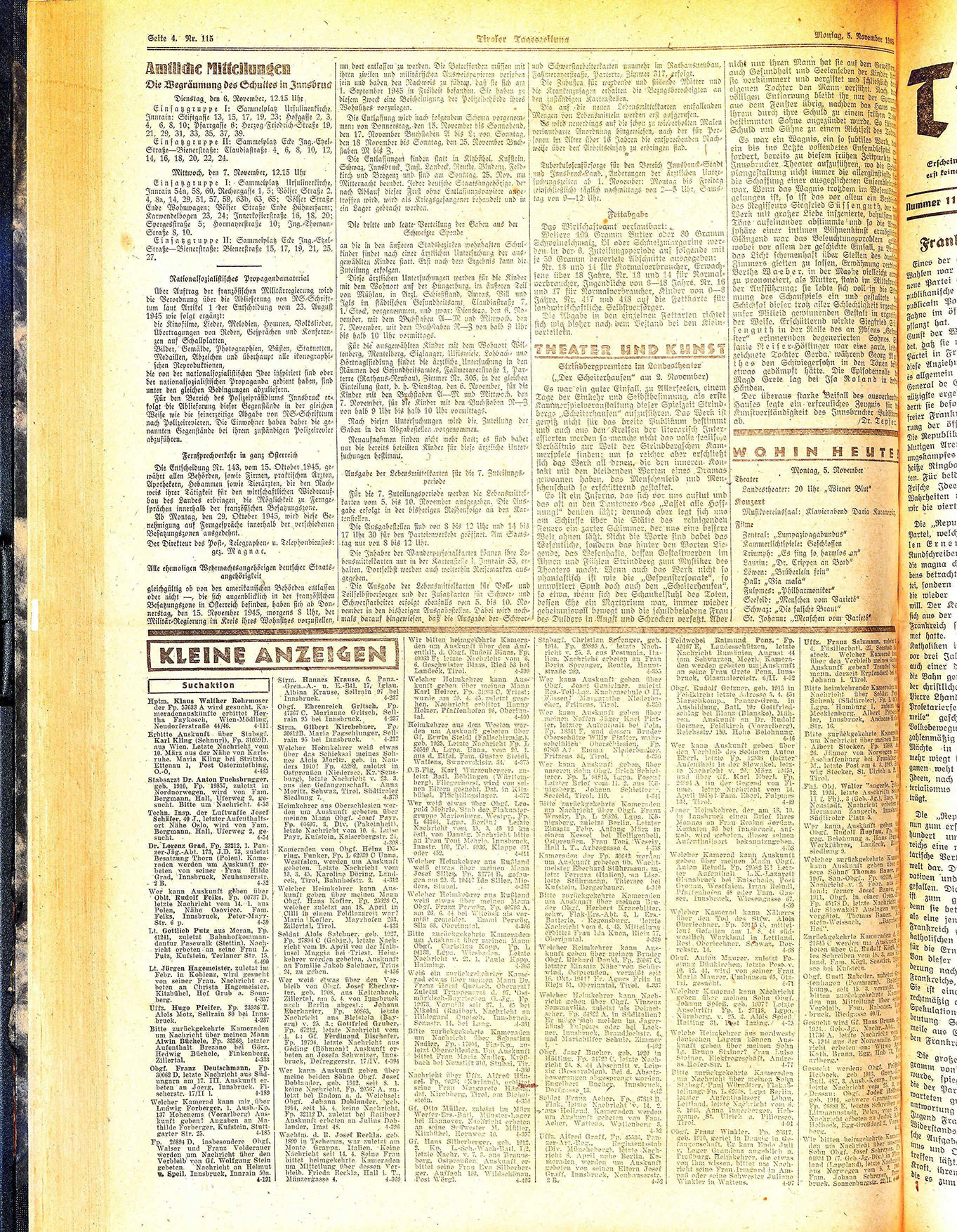Feldwebel Raimund Penz, Fp. 40167 E, Landesschützen, letzte Nachricht Rumänien August 44 (am Schwarzen. Meer). Kameraden werden gebeten um, Auskunft an seine Frau Grete Penz, Innsbruck, Glasmalereistr. 6/II. 4-52 Obgf. Rudolf Getzuer, geb. 1915 in Feldkirch: letzte Adresse 5. 4. 45: Marschkomp., Panzer-Gren. in Ausbildung, Batl. 10r Gottfriedschlag bei Blanz (Blansko), Mähren. Auskunft an Dr. Rudolf (Vorarlberg), Reienester SaHo Belohnung.