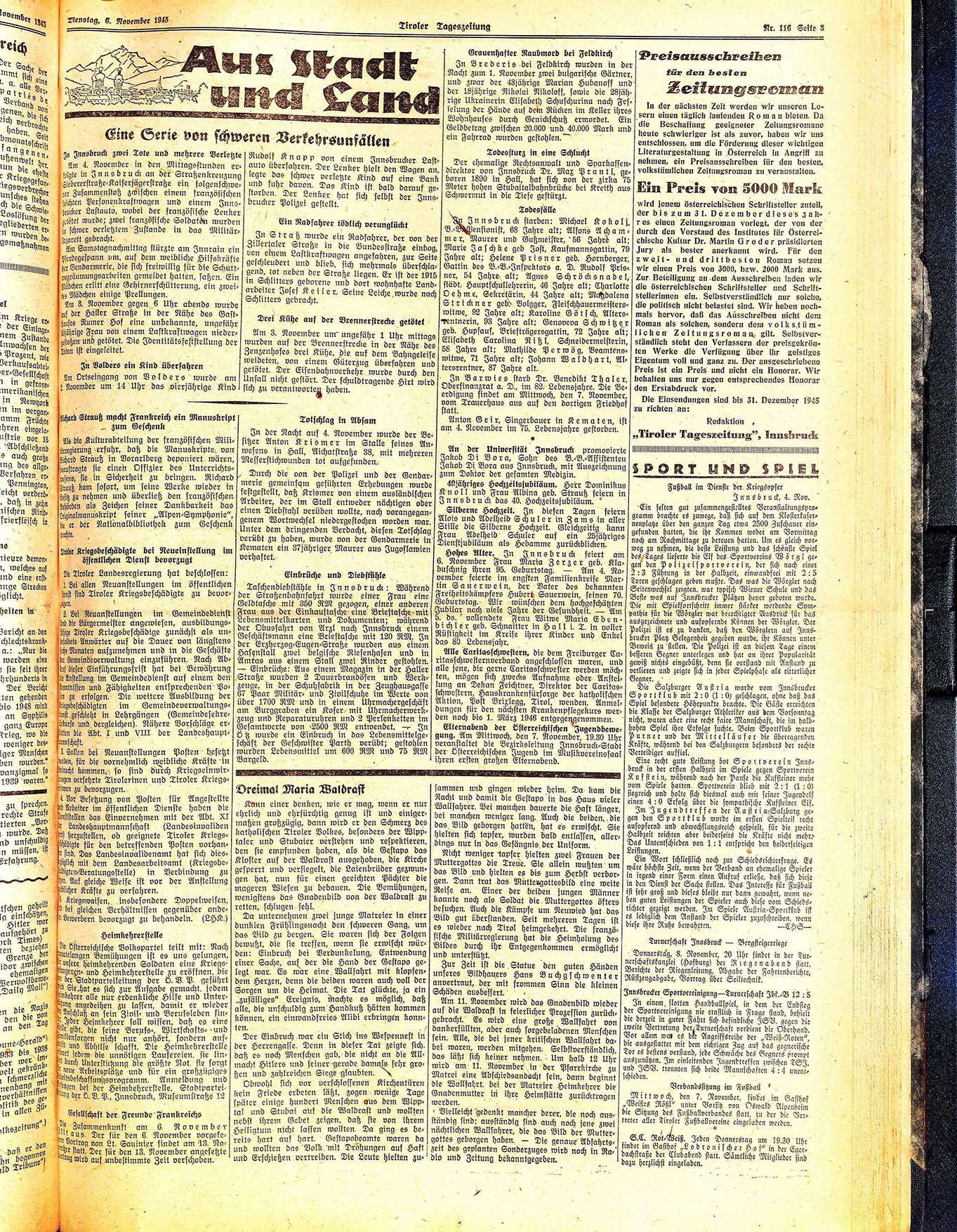 Am 3. November gegen 6 Uhr abends wurde auf der Haller Straße in der Nähe des Gastlauses Rumer Hof eine unbekannte, ungefähr Zährige Frau von einem Lastkraftwagen niedergstoßen und getötet. Die Identitätsfeststellung der Loten ist eingeleitet.