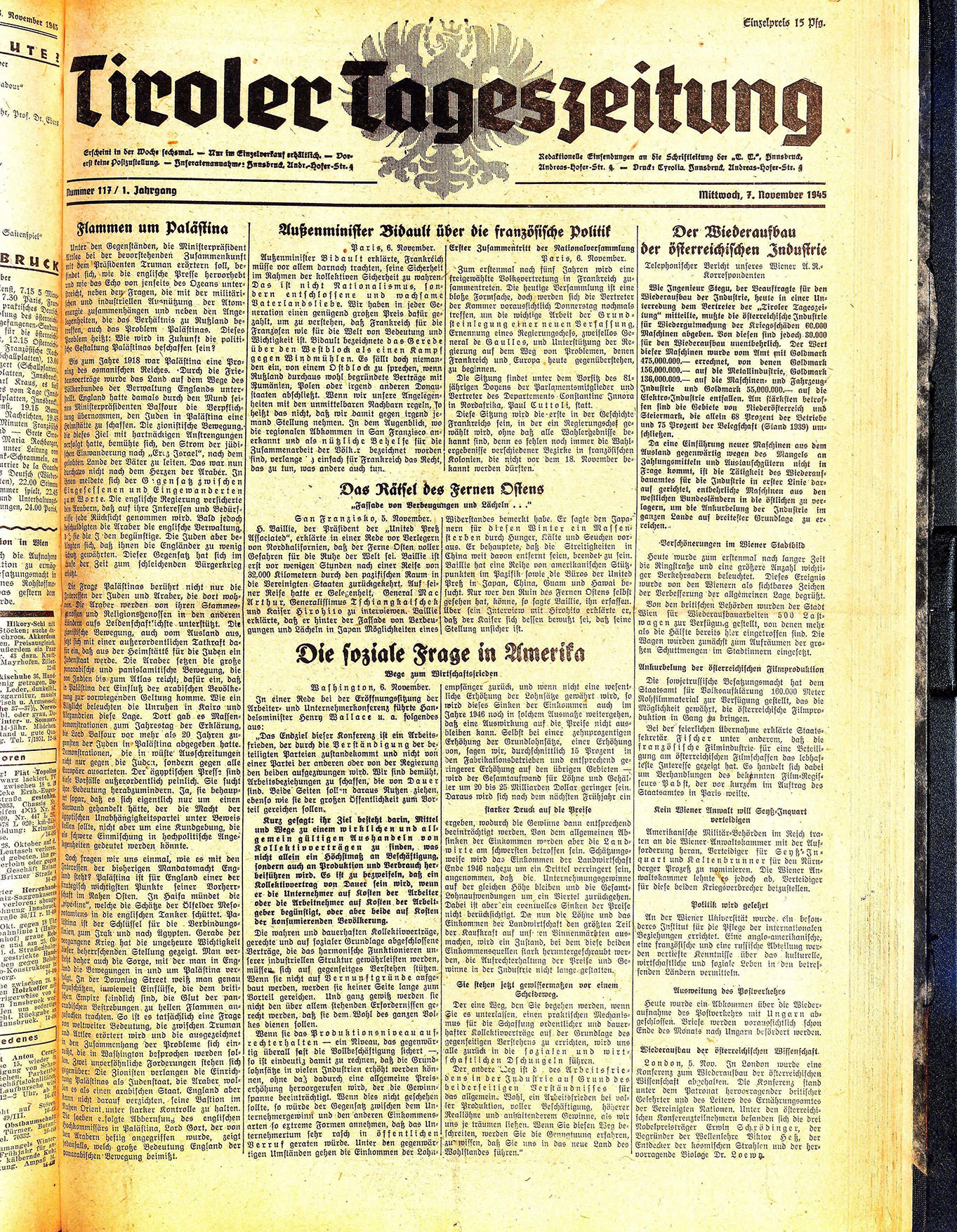Wie Ingenieur Stegu, der Beauftragte für den Wiederaufbau der Industrie, heute in einer Unterredung dem Vertreter der „Tiroler Tageszeitung“ mitteilte, mußte die österreichische Industrie für Wiedergutmachung der Kriegsschäden 60.000 Maschinen abgeben. Von diesen sind jedoch 30.000 für den Wiederaufbau unentbehrlich. Der Wert dieser Maschinen wurde vom Amt mit Goldmark