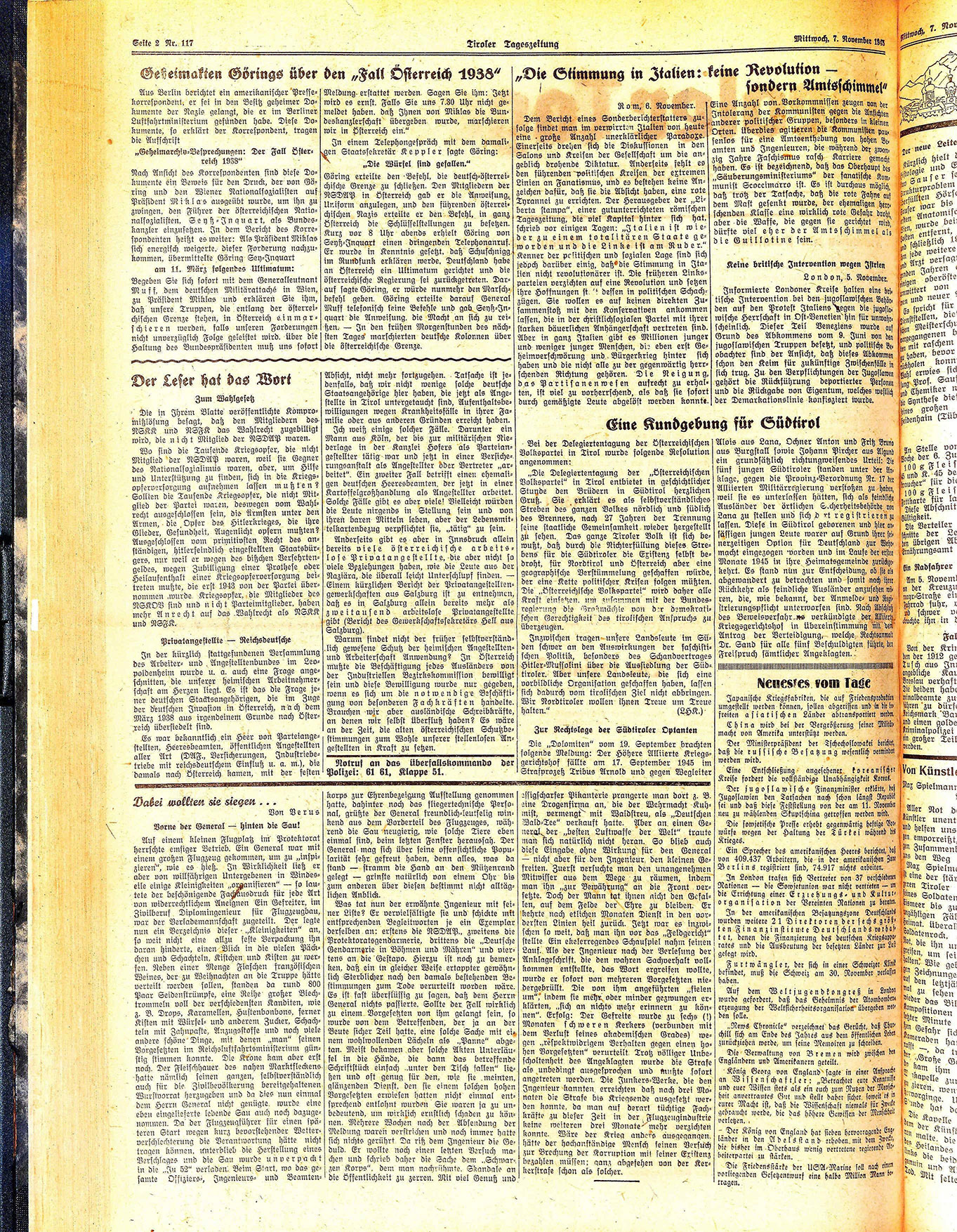 Nach Ansicht des Korrespondenten sind diese Dokumente ein Beweis für den Druck, der von Göring und den Wiener Nationalsozialisten auf Präsident Miklas ausgeübt wurde, um ihn zu zwingen, den Führer der österreichischen Nationalsozialisten, Seyß=Inquart, als Bundeskanzler einzusetzen. In dem Bericht des Korrespondenten heißt es weiter: Als Präsident Miklas sich energisch weigerte, dieser Forderung nachzukommen, übermittelte Göring Sey=Inquart am 11. März folgendes Ultimatum: Begeben Sie sich sofort mit dem Generalleutnant Muff, dem deutschen Militärattaché in Wien, zu Präsident Miklas und erklären Sie ihm, daß unsere Truppen, die entlang der österreichischen Grenze stehen, in Österreich einmarschieren werden, falls unseren Forderungen nicht