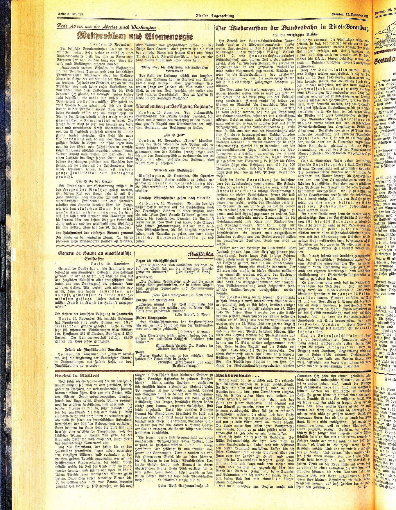 Im Bereich der Bundesbahndirektion Innsbruck schreiten die Wiederaufbauarbeiten rüstig weiter. Insbesondere wurden die zerstörten Oberbauanlagen in den Bahnhöfen Wörgl, Solbad Hall i. T. und Innsbruck=Hauptbahnhof (Güterbahnhof) zum großen Teil wieder instandgesetzt. Auch der Wiederherstellung der zerstörten Hochbauanlagen in den zerstörten Bahnhöfen wird volles Augenmerk zugewendet. Wichtig wies sich die Wiederhersteuung der zerstörten Fahrdrahtleitungen, um die wiederhergestellten Gleise mit elektrischen Fahrzeugen befahren zu können.