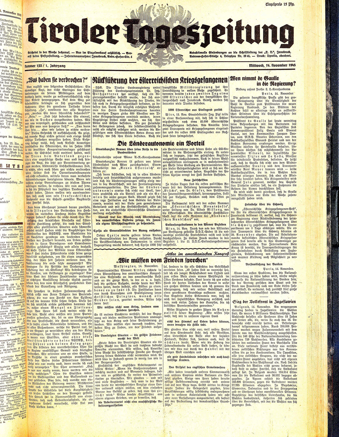 Erscheint in der Woche sechsmal. — Nur im Einzelverkauf erhältlich. — Vorerst keine Postzustellung. — Inseratenannahme: Innsbruck, Andr.=Hofer=Str. 4